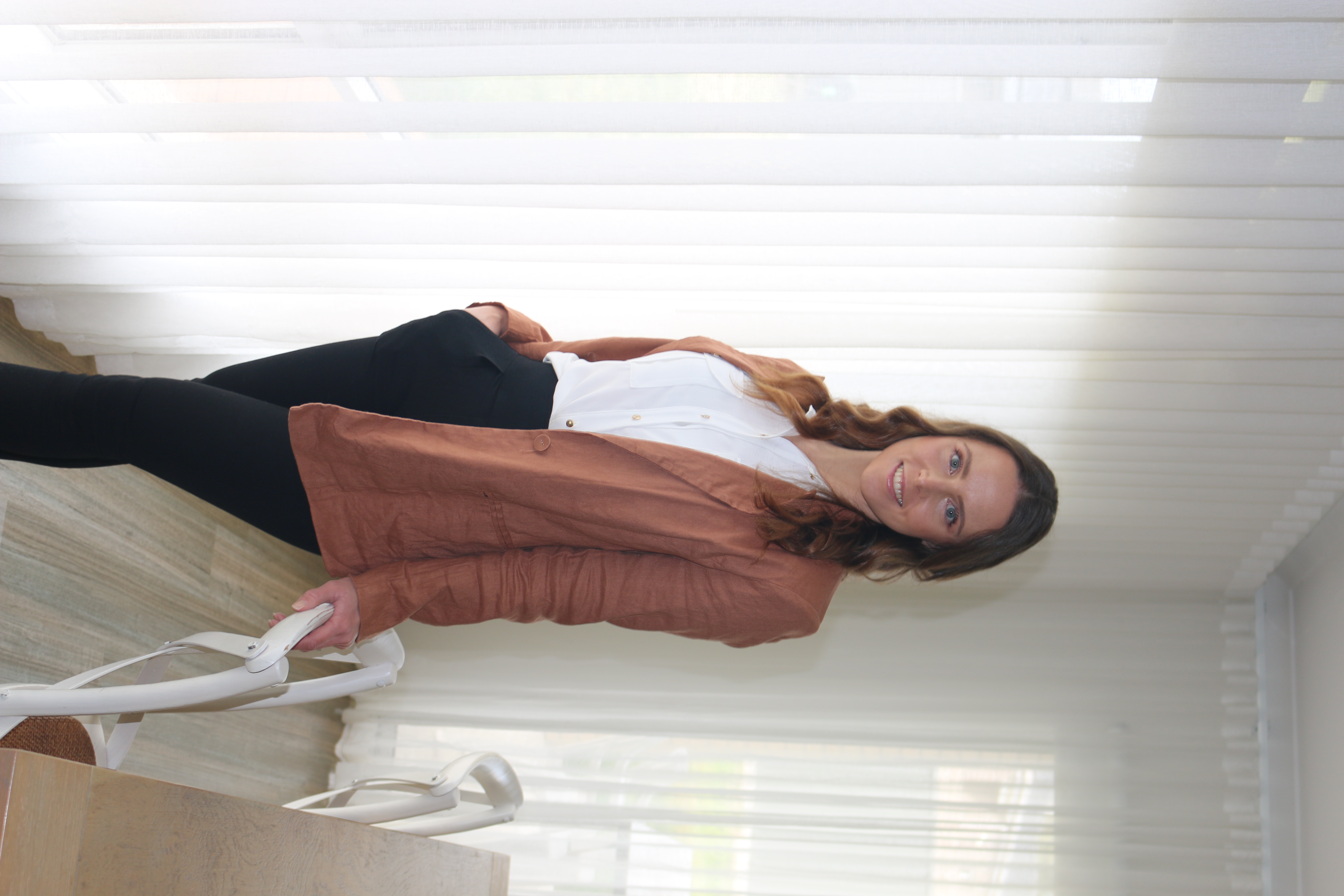 use person in this photo and make it look like they are pointing to material samples on the table the setting is an interior design consultation