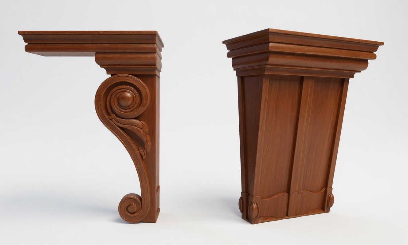 create a 3d model of the corbel based off the front and side view in the reference make the color similar to benjamin moore ryan red