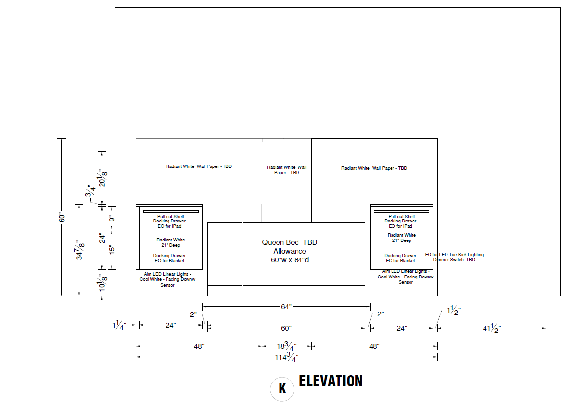 this elevation drawing provides a detailed layout for a custom bedroom wall installation likely for a master suite or guest room dimensions layout the design features a symmetrical arrangement centered around a queen bed with integrated cabinetry on either side total width the main unit measures wide with an additional section to the right total height the primary cabinetry and headboard wall reach a height of bed allowance a central space of is designated for a queen sized bed cabinetry features both the left and right side units include specialized storage and utility features pull out shelves includes a dedicated docking drawer with electrical outlets eo for ipads deep drawers below the pull out shelf is a deep radiant white drawer blanket storage a lower docking drawer is specified specifically for blankets also featuring electrical outlets wall finish the upper sections are designated for radiant white wall paper tbd lighting electrical the plan incorporates several modern lighting elements linear lights aim led linear lights cool white are mounted facing downward with an integrated sensor toe kick lighting led lighting is included at the base controlled by a dimmer switch electrical outlets multiple eo electrical outlet points are integrated directly into the cabinetry for seamless charging would you like to explore material options for the radiant white finish or look for specific docking drawer hardware