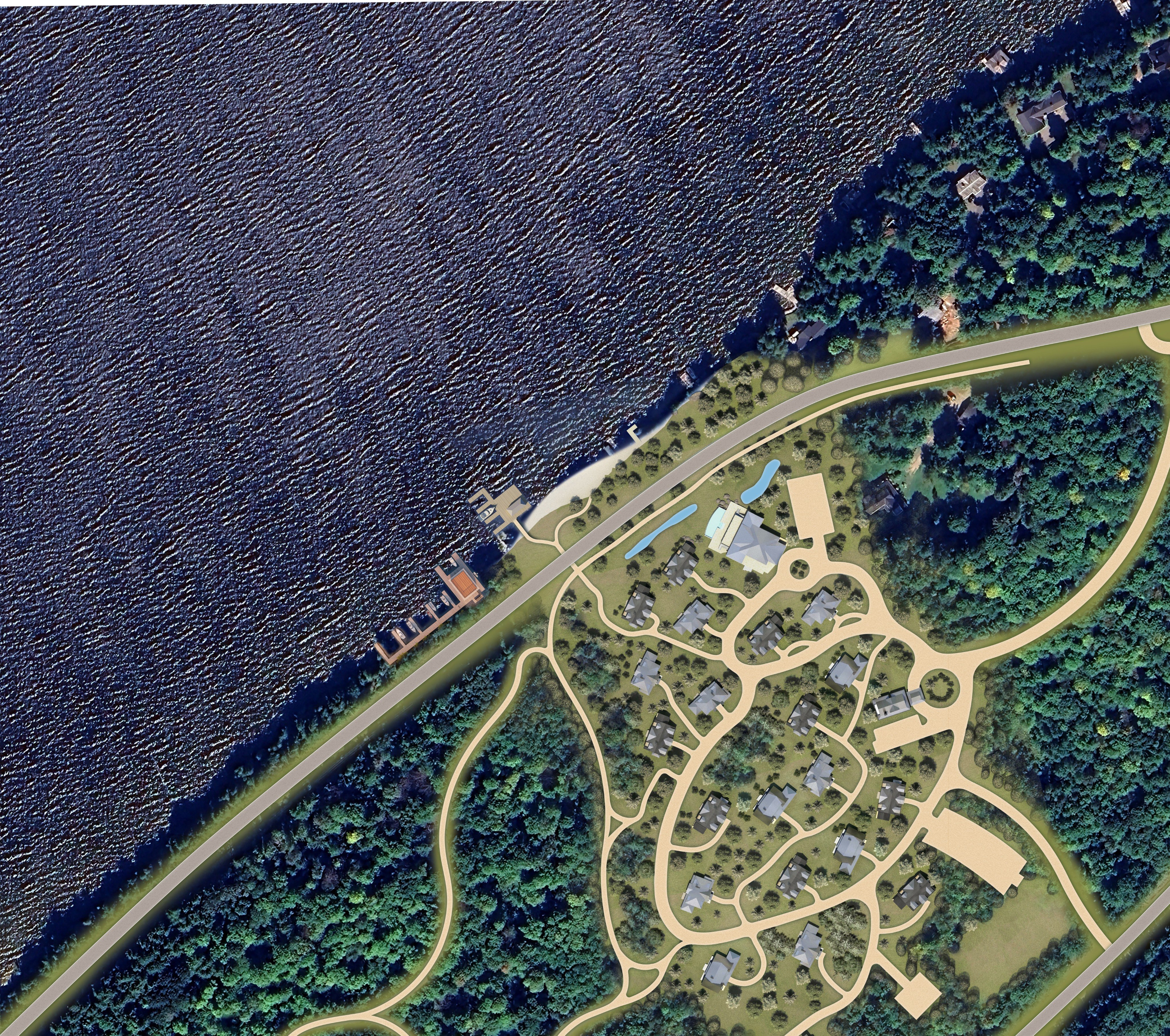 top view site map golden hour lighting keep the size as is blue water keep the aerial dead on top view