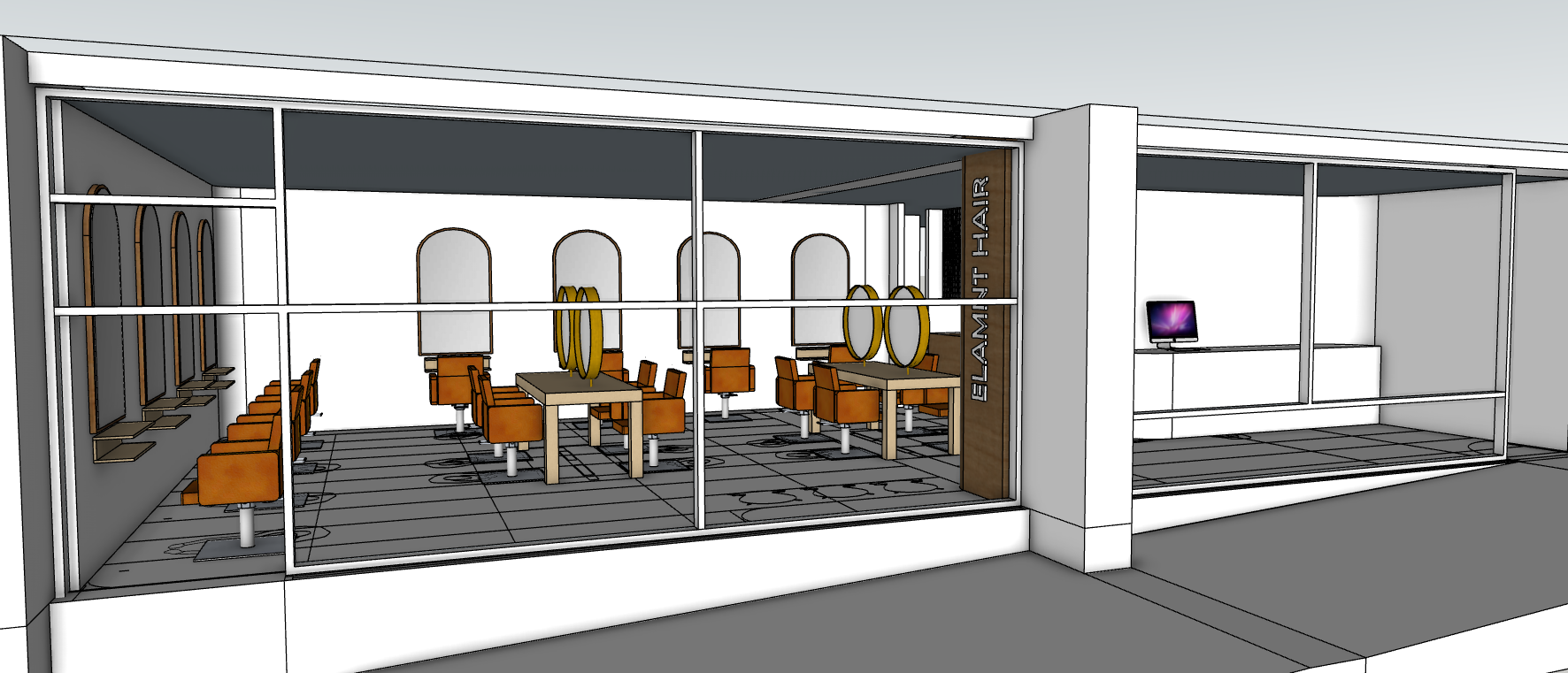 cream concrete renderwalls gold trim mirrors leather chairs with gold trims greenery above mirrors polihsed concrete floor illuminated writing people getting hair cut
