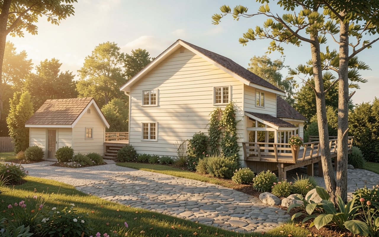 create a stunning architectural rendering of a modern craftsman style house the exterior features include a grey gabled roof and contrasting light grey horizontal siding incorporate dark grey or black accents for the trims and window frames the stone elements on the foundation and columns should be a natural earthy brown with varied textures the garage doors should be deep charcoal grey adding a sleek modern touch the surrounding landscape should evoke a serene suburban setting with homes in the background with lush green lawns and well maintained shrubs include a bright blue sky with soft fluffy clouds to create a calm inviting atmosphere use warm sunlight to enhance the textures and colors casting gentle shadows for a realistic effect