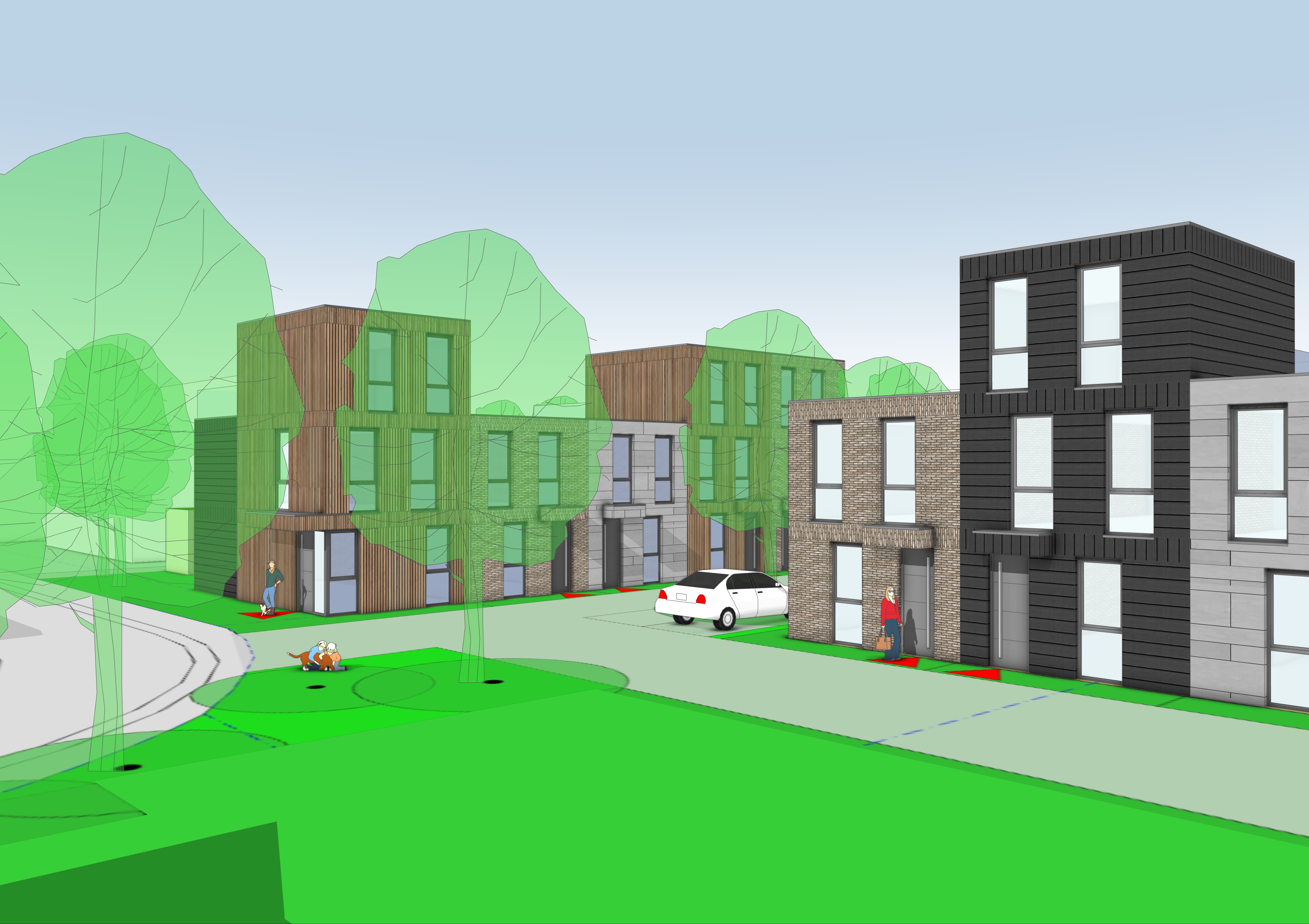 make a photorealistic rendering of the houses the weather is sunny with a few clouds in the sky add a lot of people bushes trees and flowers