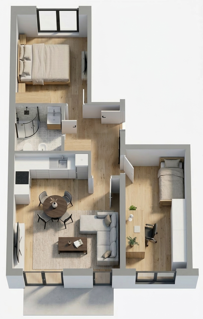 convert this floor plan into a realistic isometric 3d view of a full house show the space from an elevated angle with furniture walls and details visible different angle dont change anything use the same furniture as shows on the plan do not change the orientation of the floorplan