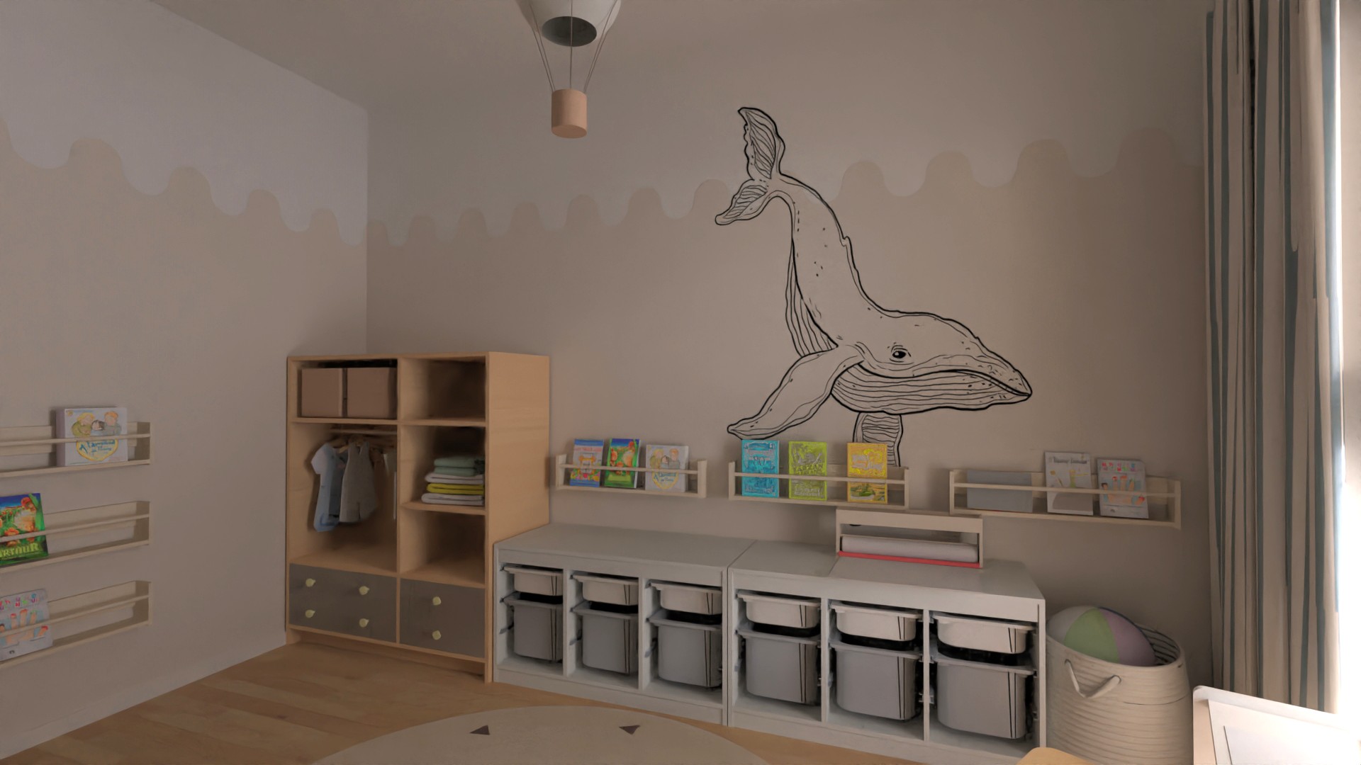 the whale on the wall is drawn with a black line it is flat do not change the image of the whale leave the image of the whale unchanged do not add anything do not interpret anything