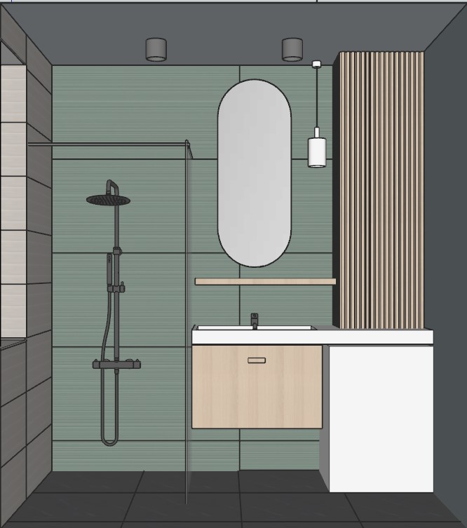 make a photorealistic picture leave the original colors of the material ceramics have a reflection put lighting behind the mirror and add light to the pendant and spotlights to the ceiling on the far right is an open washing machine raise the shower to a higher height