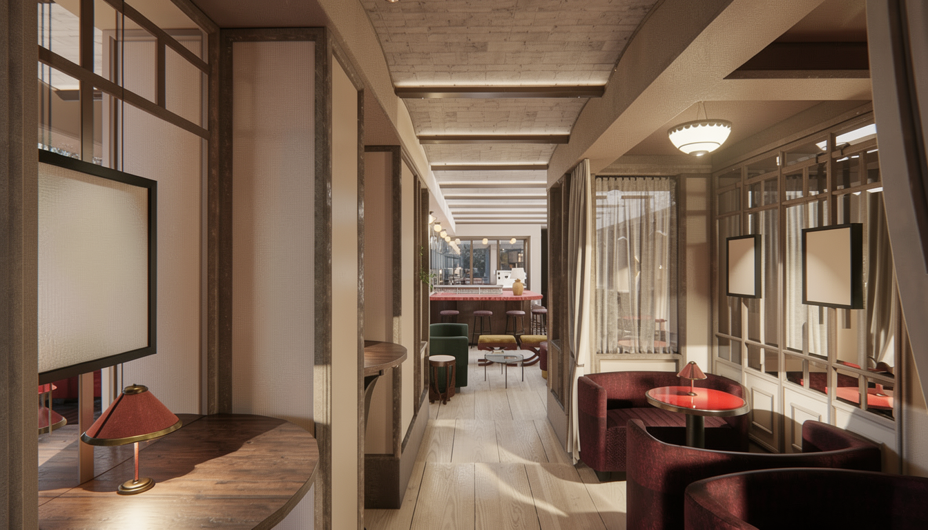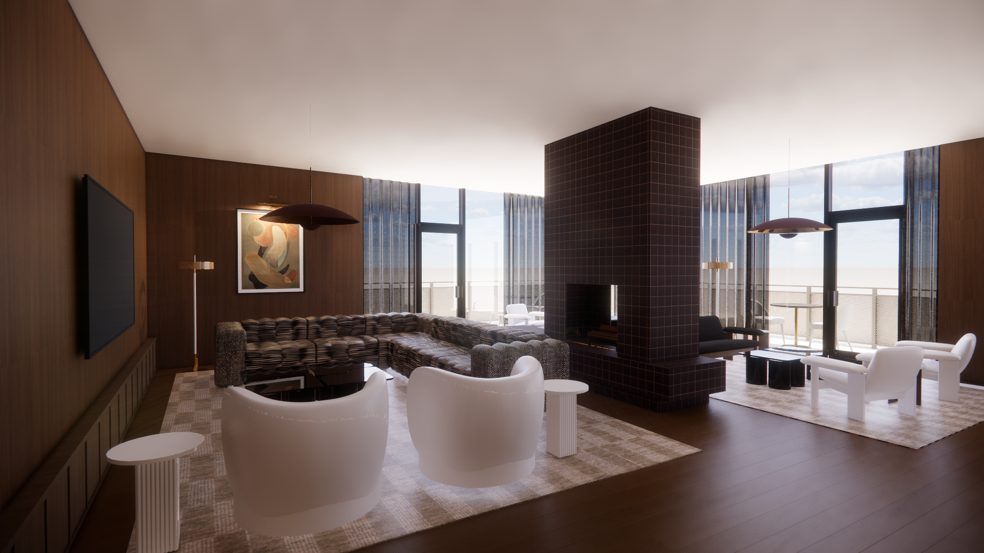 golden hour lighting outside warm moody lighting show fire in the log fireplace curtains are sheers with dark chocolate velvet overdrapes show people in the space watching the tv and looking out at the view side tables are black lacquer armchars are rust red velvet with walnut frame and legs