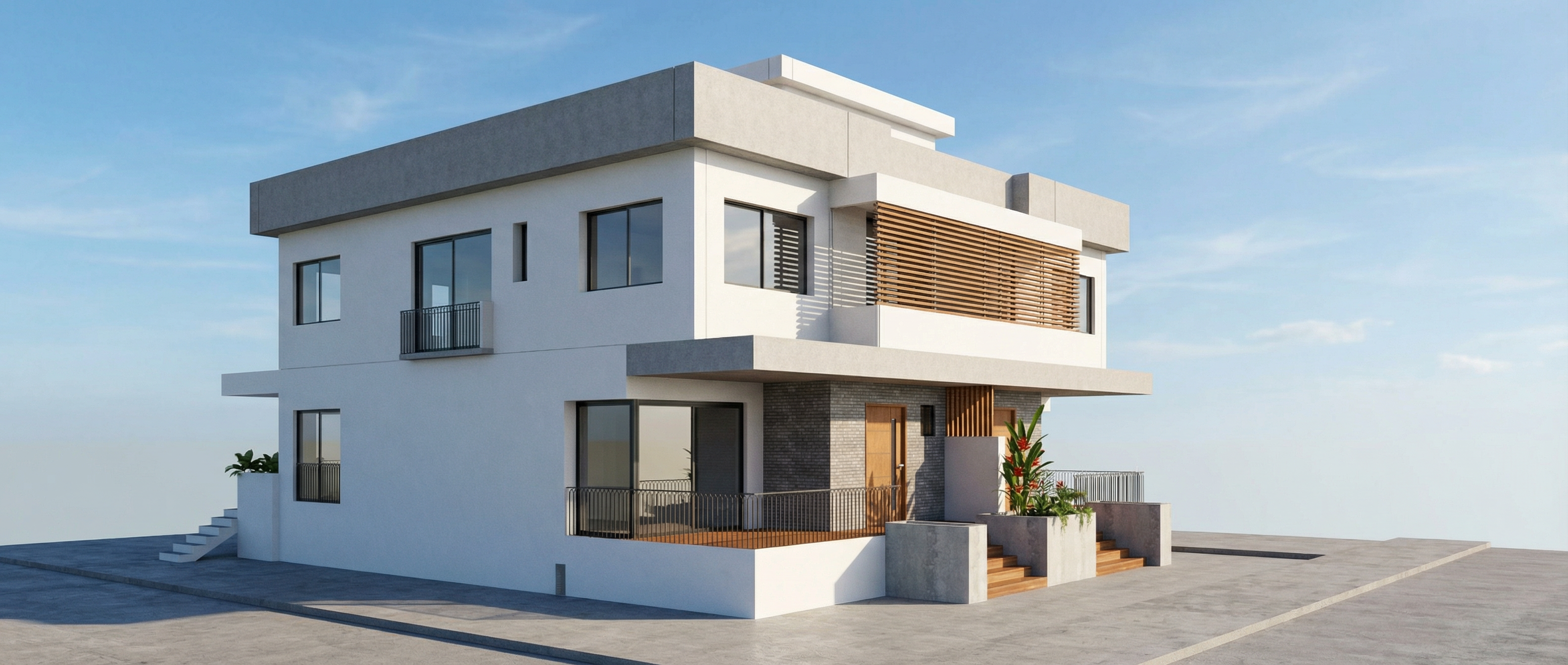 modern minimalist house concrete exterior with a smooth texture light grey walls dark grey roof large glass windows reflecting light surrounded by lush green garden clear blue sky with soft white clouds warm inviting atmosphere with soft sunlight add garage in the hole on the left and a path to entrance and garage right side windows indoor gym part inside