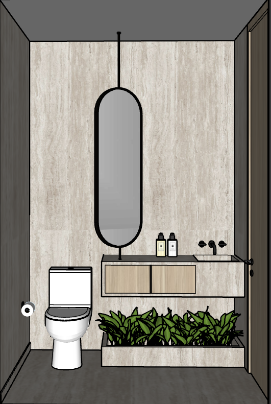 render a sleek modern bathroom with a tranquil atmosphere the walls have a light beige marble texture at the center a large vertically oval mirror with a black frame hangs above a floating vanity made from light wood the countertop is minimalist with two bottles in shades of muted yellow and white on the right side an elegant sink with matte black fixtures is visible below a planter box filled with vibrant green foliage adds a touch of nature the floor is a smooth light gray marble complementing the left wall the lighting is soft and warm creating an inviting and relaxing ambiance