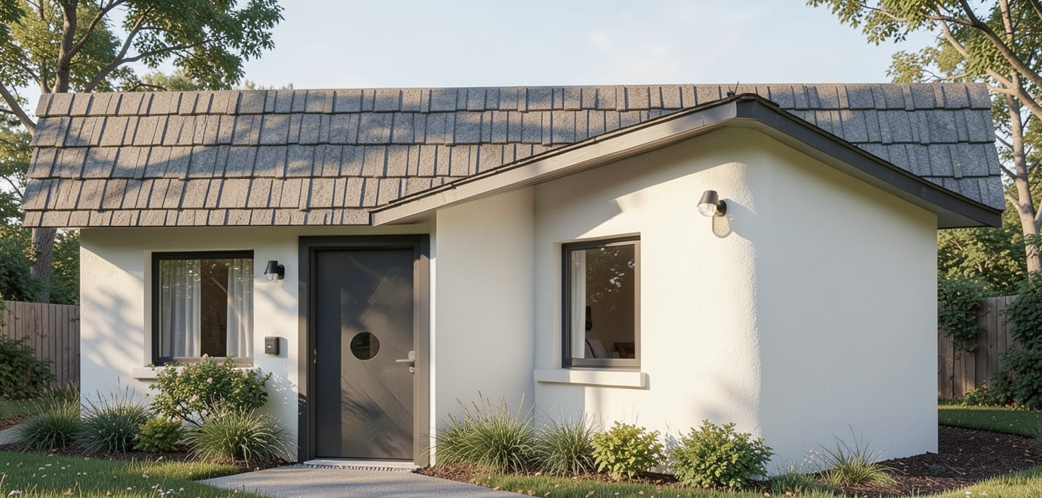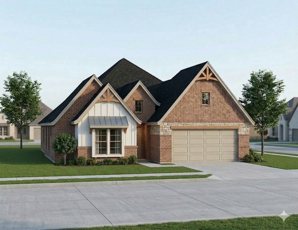 generate a realistic image based on the drawing uploaded do not describe the render do not write a specification and do not output text explanations the final output must be a realistic image use the uploaded image as the sole authoritative reference hierarchy strict exterior absolute authority for fa ade design materials proportions roof absolute authority for roof geometry pitches ridges valleys overhangs reference only no redesign or reinterpretation critical constraints non negotiable zero design changes are allowed do not modify massing roof design pitches overhangs or ridge locations do not move resize add or remove windows doors trims or architectural features do not alter material layout or transitions if something is not shown in the images do not add it match the building footprint exactly match all vertical proportions exactly and model the roof exactly as shown in the image roof composite shingle roof awning to be standing seam metal roof no simplification or artistic interpretation exterior wall materials apply materials exactly as shown in the elevations brick herringbone on wall above garage door only stone cedar accents match texture scale material boundaries and finish precisely do not change material on any wall strict rule no changes to any wall material openings details windows and doors must match garage doors cedar trim depth must be realistic but not exaggerated camera view eye level exterior camera approximately 5 6 above grade primary view front exterior perspective showing main entry no wide angle distortion vertical lines must remain straight lighting realistic natural daylight soft shadows physically accurate reflections neutral professional real estate quality lighting no cinematic or dramatic effects neighborhood context place the home in a realistic suburban neighborhood surrounding homes must be similar in architectural style scale roof form and materials homes should feel like the same subdivision with subtle variation include realistic street driveway sidewalk lawns and minimal landscaping no distracting elements generate the image now output only the realistic image