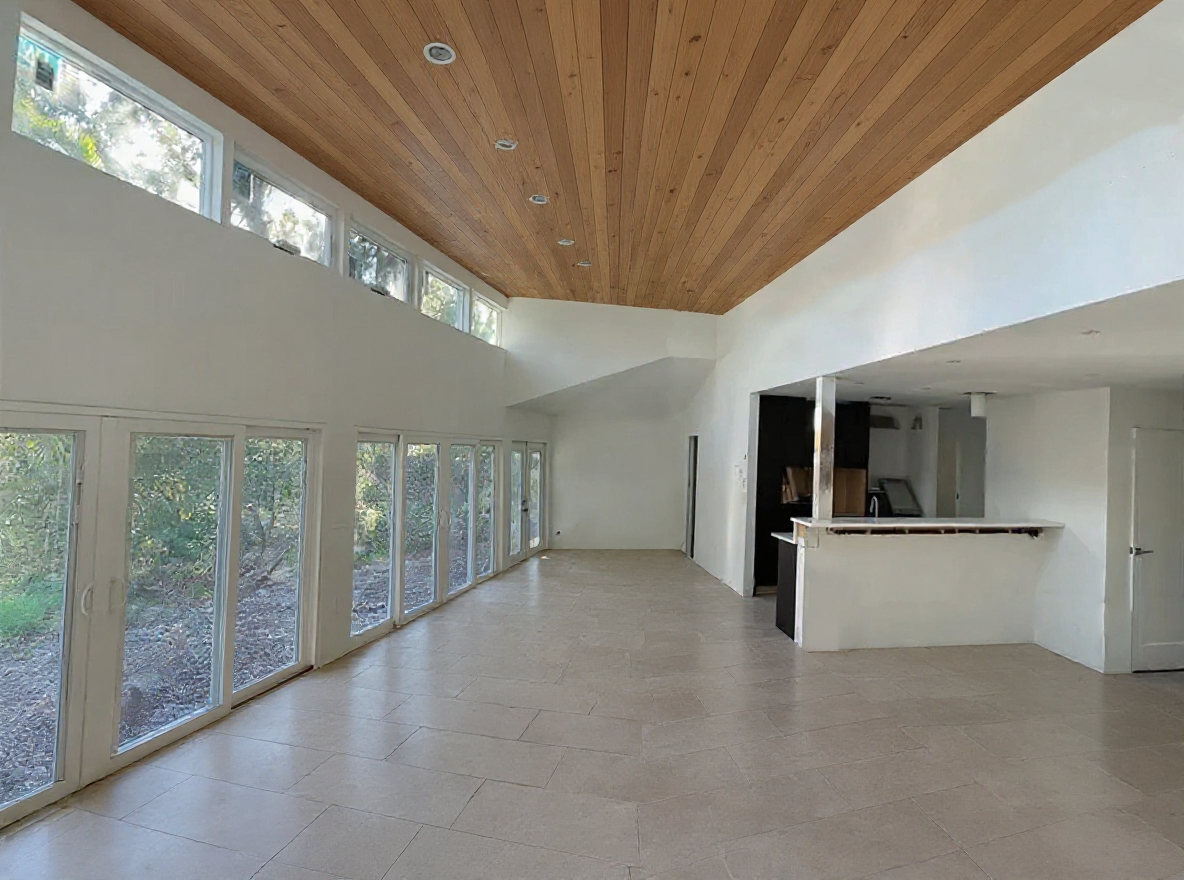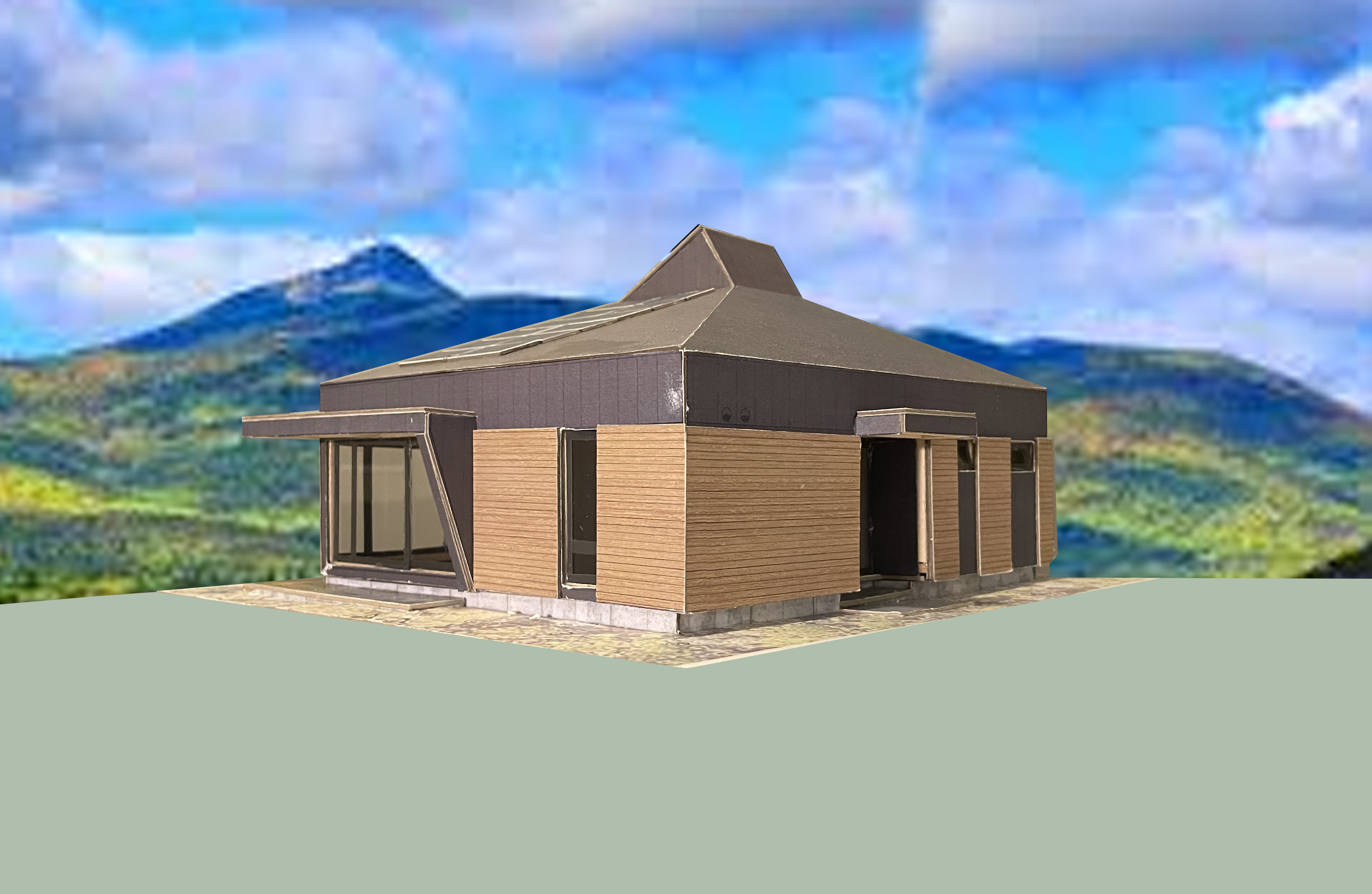 modern house with large windows grey metal roof and siding horizontal mahogany lap siding rooftop solar panels and skylights located on mountain with distant valley and new england mountains in background set in a meadow clearing surrounded by a pine forest pines sun on face of building