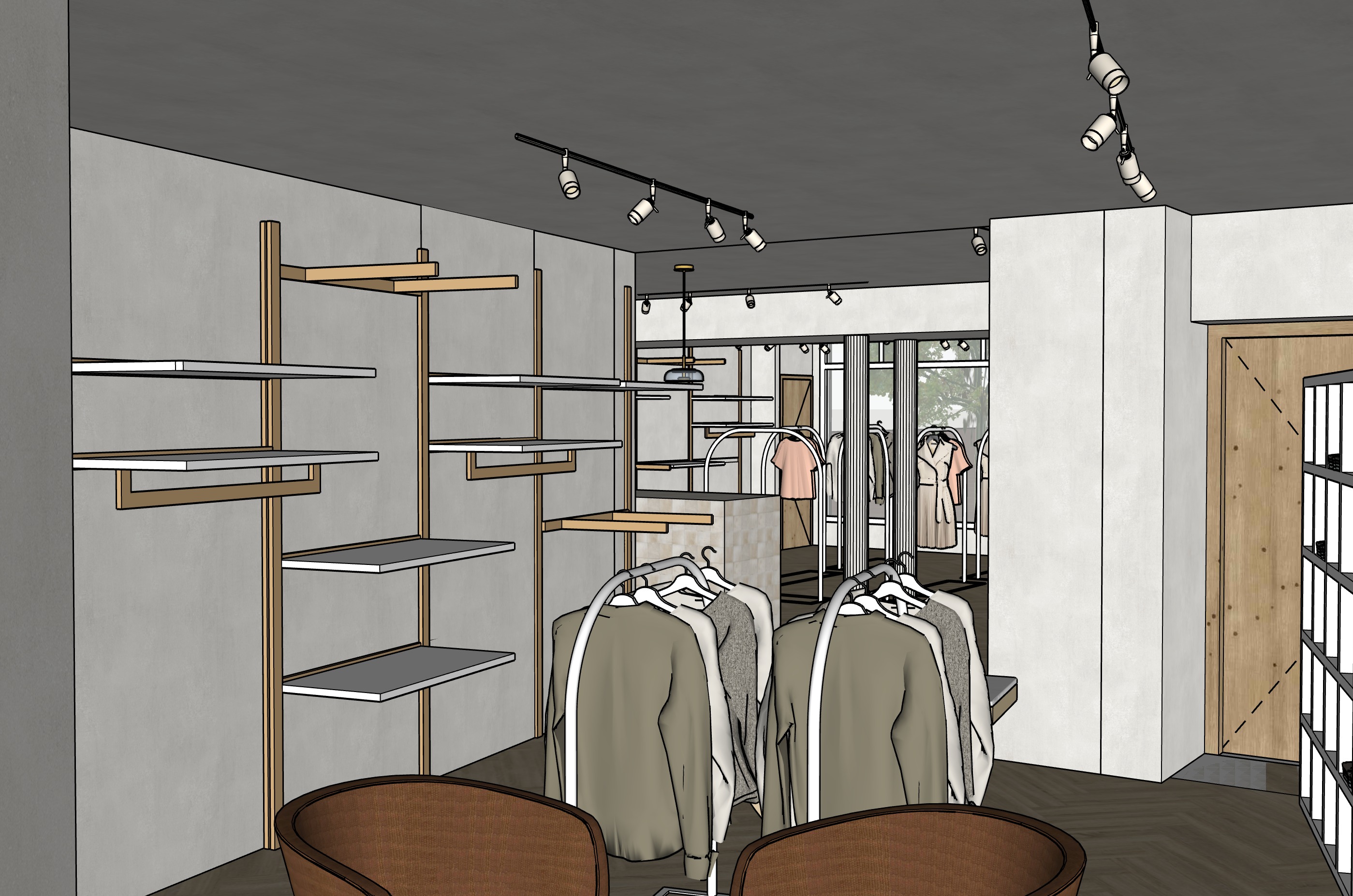 add realism chairs should be from soft brown fabric racks should be with clothes soft pastel colors make doors taupe in stead of wood