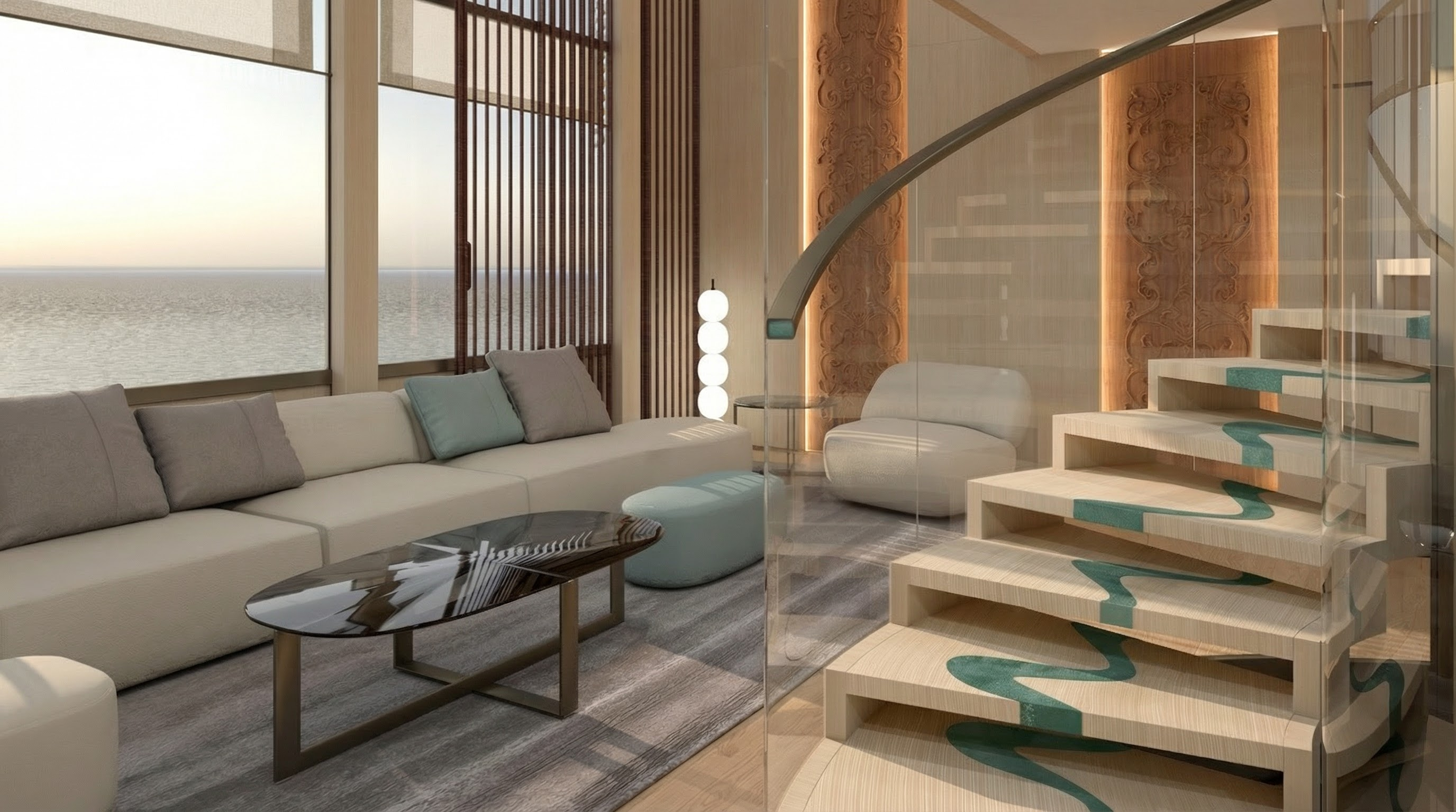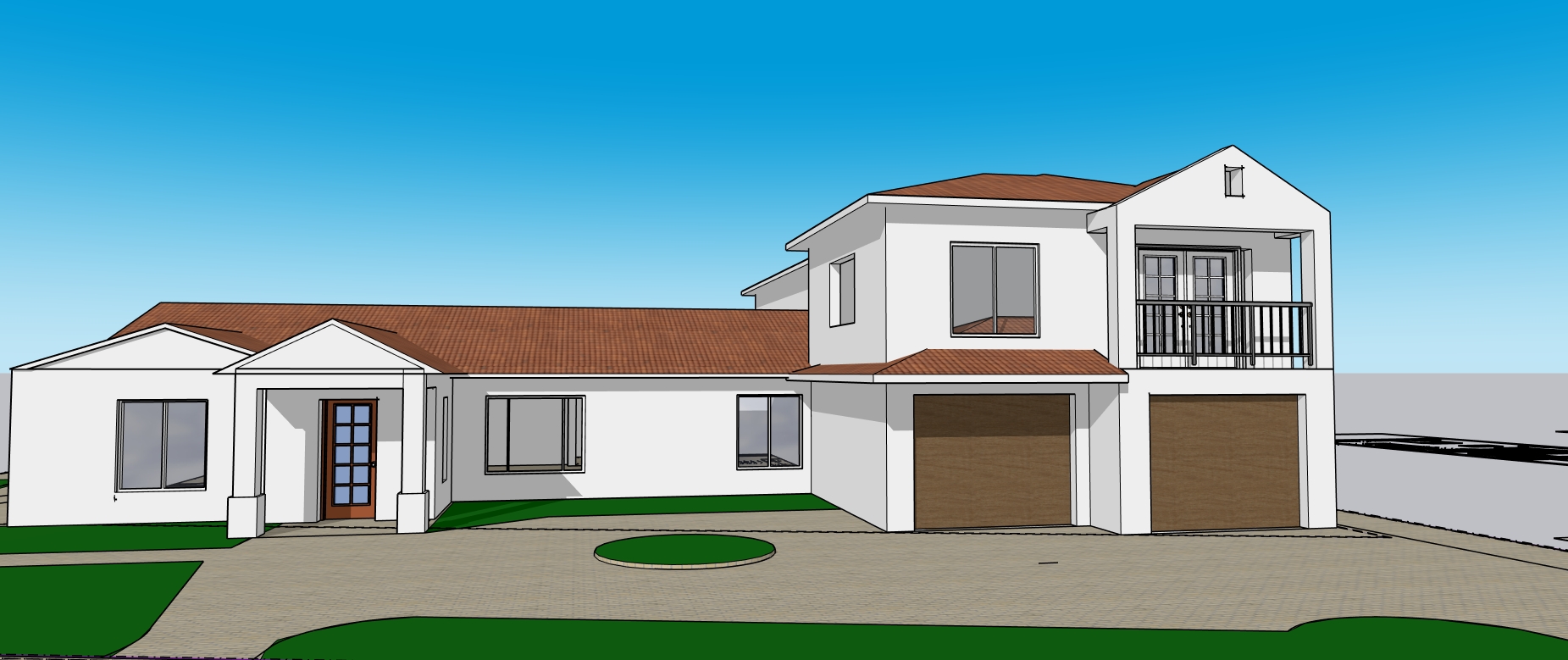 a modern two story house with a minimalist spanish style design alys beach styke with a parapet the exterior walls are painted in crisp white complementing the sleek white window frames the roof is clad in terracotta tile adding warmth and texture surround the house with lush green grass and a neatly paved driveway made of light gray cobblestones the sky above is a clear azure blue with soft fluffy white clouds adding a serene touch the atmosphere is peaceful and inviting evoking a sense of tranquility and modern elegance tropical luxurious landscape
