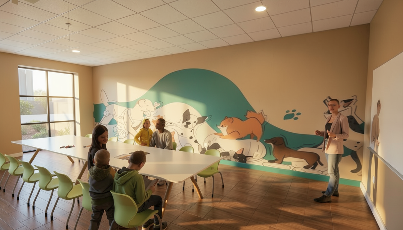 render this make the floor blue speckle vinyl the wall behind the dog washes is a ribbed concrete wall panel add towels to the bone shelf between the dog washes add depth to the yellow slogans right wall purple right wall pale blue make the bones on the right white make counter tops dark blue speckle