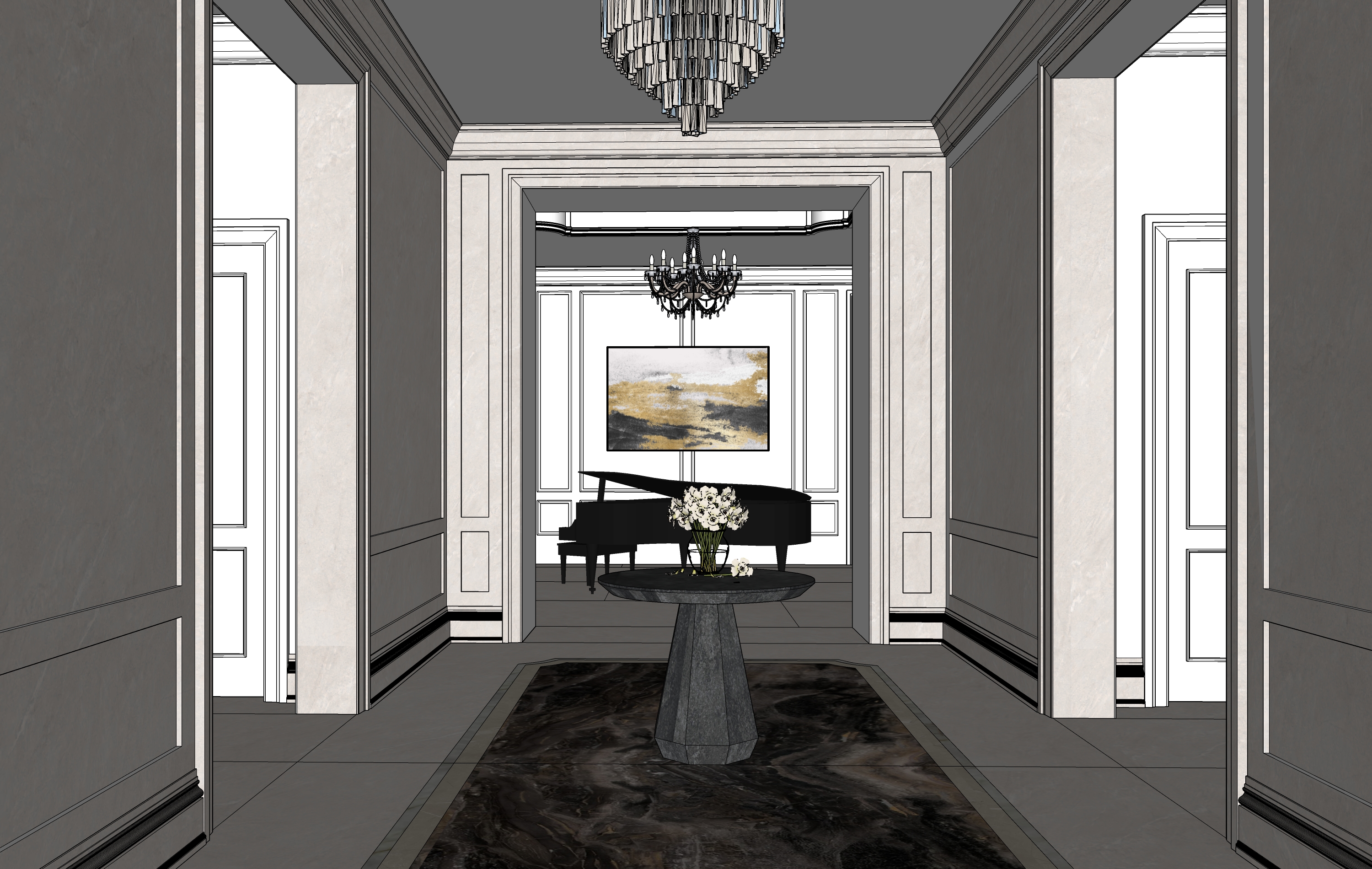 create a highly realistic architectural interior rendering based strictly on the provided reference image absolute fidelity to proportions materials colors lighting furniture and props is required no artistic reinterpretation foyer flooring critical main floor is light cream natural stone matching exactly the tone warmth and brightness of the reference image the central custom made inlay must be bano orobico marble bookmatched from top to bottom along the longitudinal axis the bano orobico texture must be darker and cooler leaning towards charcoal gray and soft black not warm brown or coffee tones veining should be refined and elegant with gray black movement and minimal warm coloration finish is polished but subtle not overly glossy foyer walls moldings walls are carved natural stone in a light cream warm ivory tone matching the surrounding floor stone color family all moldings trims casing and wall panel details in the foyer must be the same carved light cream stone material walls must remain bright and luminous no darkening no gray cast no heavy shadows piano hall flooring the piano hall floor must use the same light cream stone texture and color as the surrounding foyer floor follow the same floor pattern indicated in the reference image maintaining scale rhythm and alignment piano hall walls moldings walls and moldings in the piano hall must be pure white smooth laminated painted finish as shown in the reference image lighting ambience very important the ambience must be identical in both the foyer and the piano hall use consistent artificial lighting only throughout the entire space no natural daylight no window light no directional sunlight in the piano lounge lighting must be warm balanced soft and evenly distributed with uniform exposure between both spaces avoid any visual separation in mood or brightness between rooms furniture props preserve all furniture d cor and object placement exactly as in the reference image rendering style ultra photorealistic luxury interior physically accurate materials pbr soft reflections realistic shadows high end architectural photography quality strictly follow the reference image do not stylize dramatize or reinterpret materials or lighting