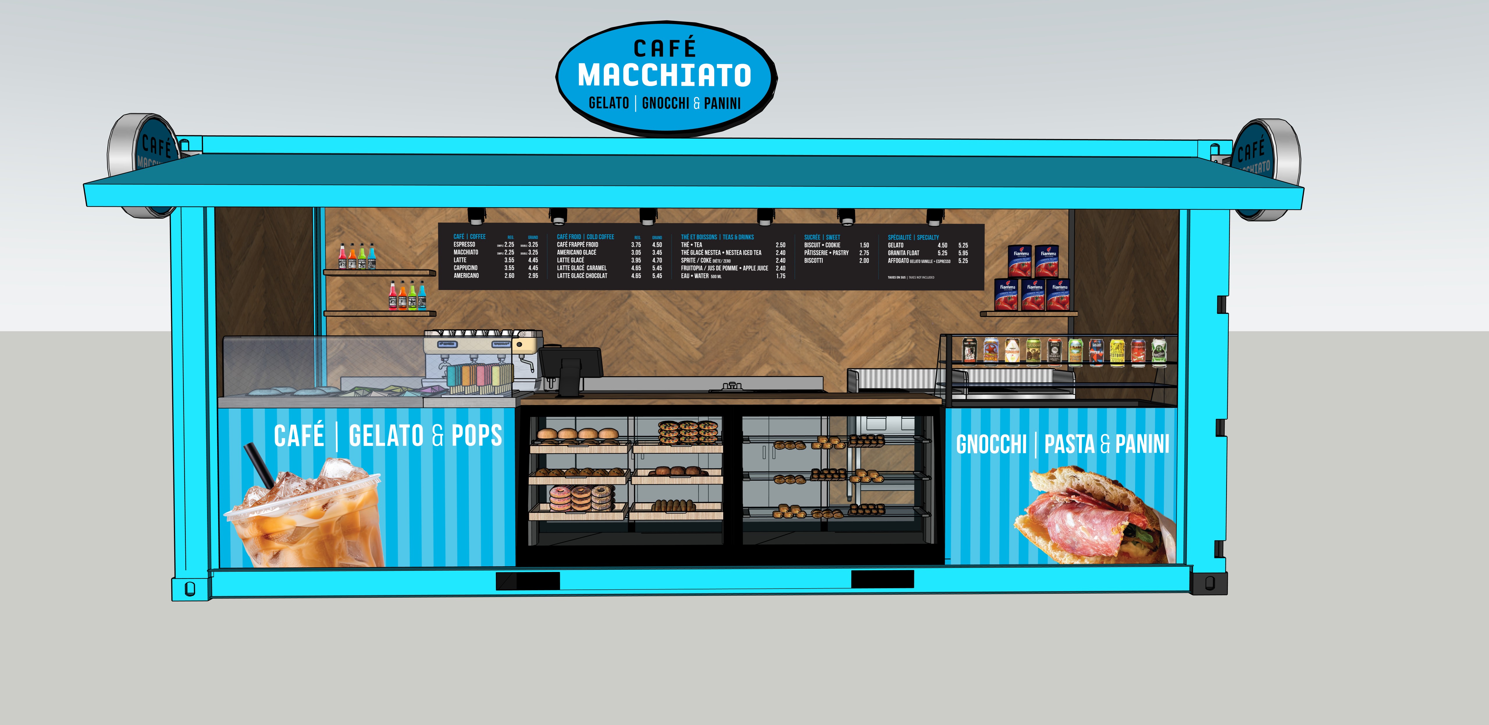 this is an exterior shipping container that measures 20 feet wide by 8 feet deep include two baristas inside the container one barista is making coffee and the other is at the cash place the container on a paved walkway with daytime sunny sky add 4 pendant lights the container interior of should be wood panels signage should be the same as sample image keep architecural details exactly the same as 3d sketch signage should be exactly as image in high detail keep the same angle as sketch
