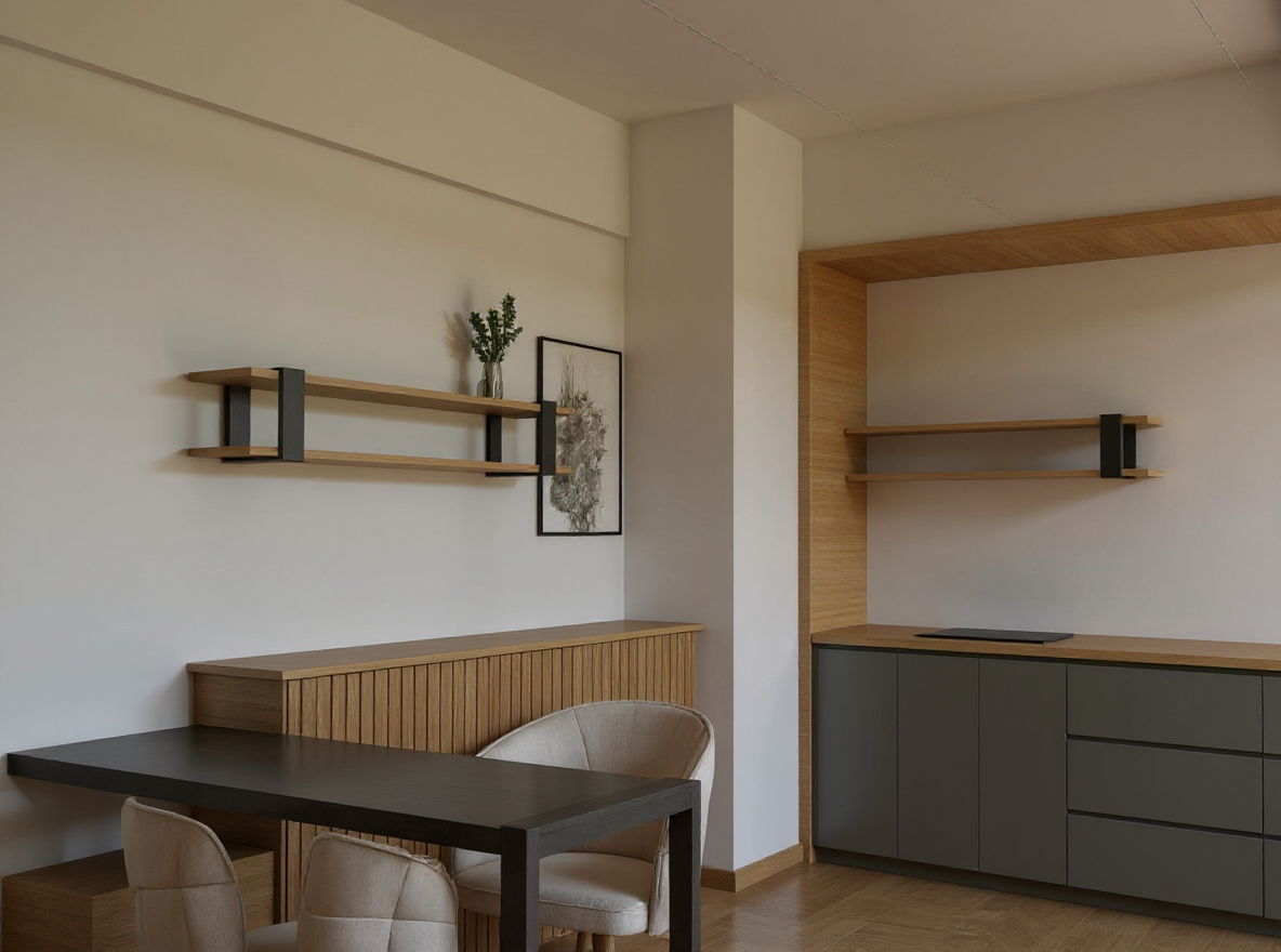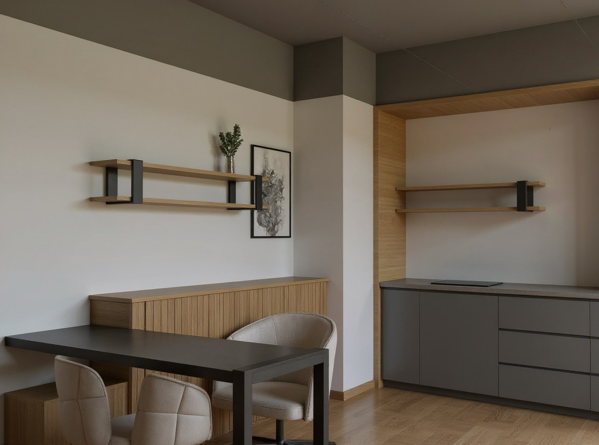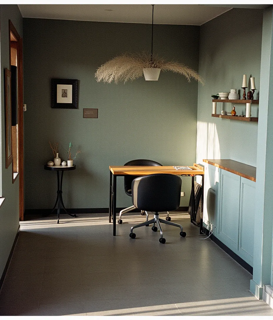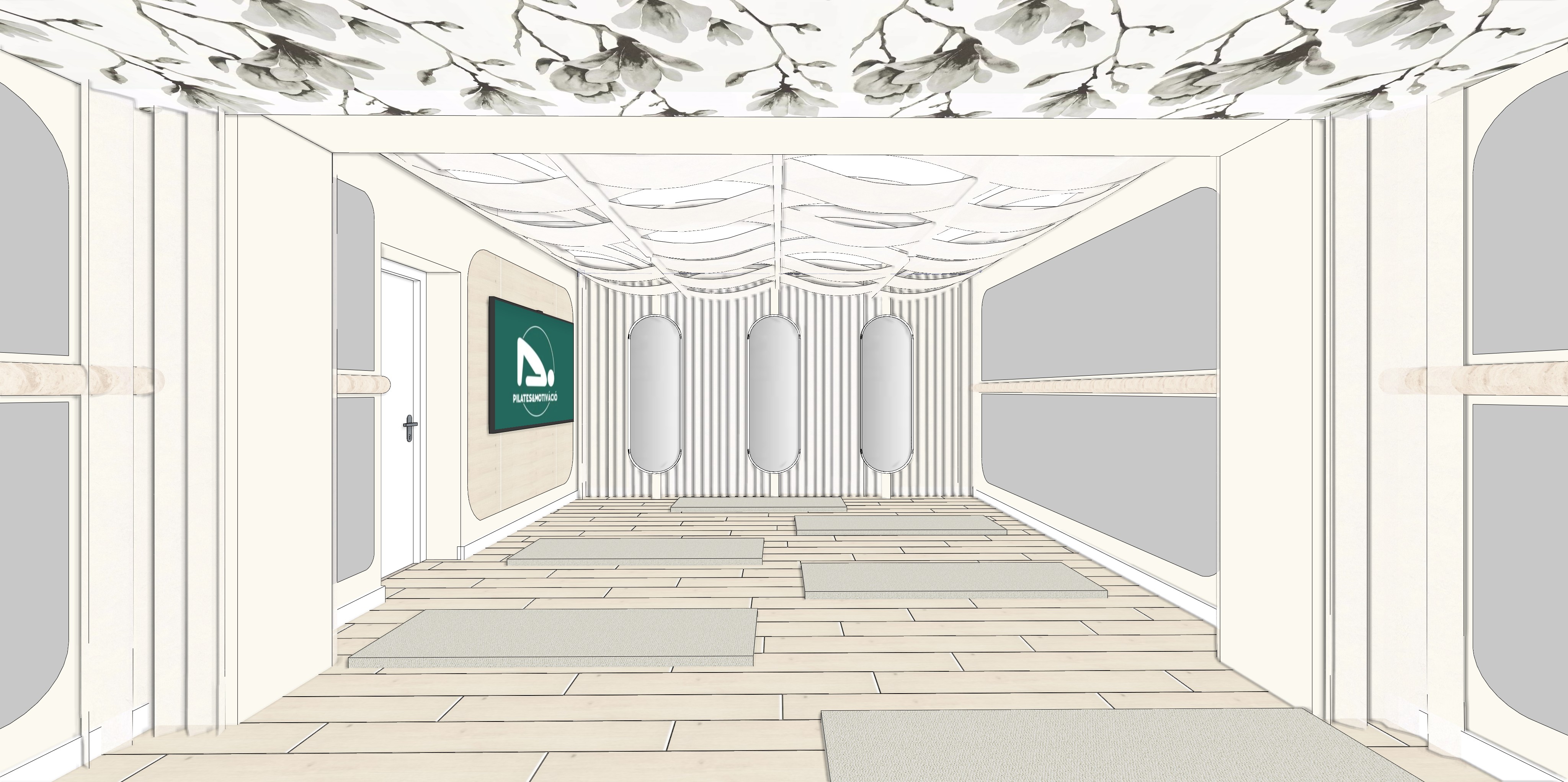 exterior shot photorealistic interior render based strictly on the uploaded image keep exact geometry proportions and layout minimal pilates yoga studio whitewashed natural wood parquet floor off white matte walls grey wall panels are real mirrors with subtle hidden backlighting light fabric curtains hanging from the ceiling and covering the back wall window front ceiling finished with soft floral wallpaper realistic texture natural neutral daylight true white balance professional interior photography look sharp details realistic materials no stylization