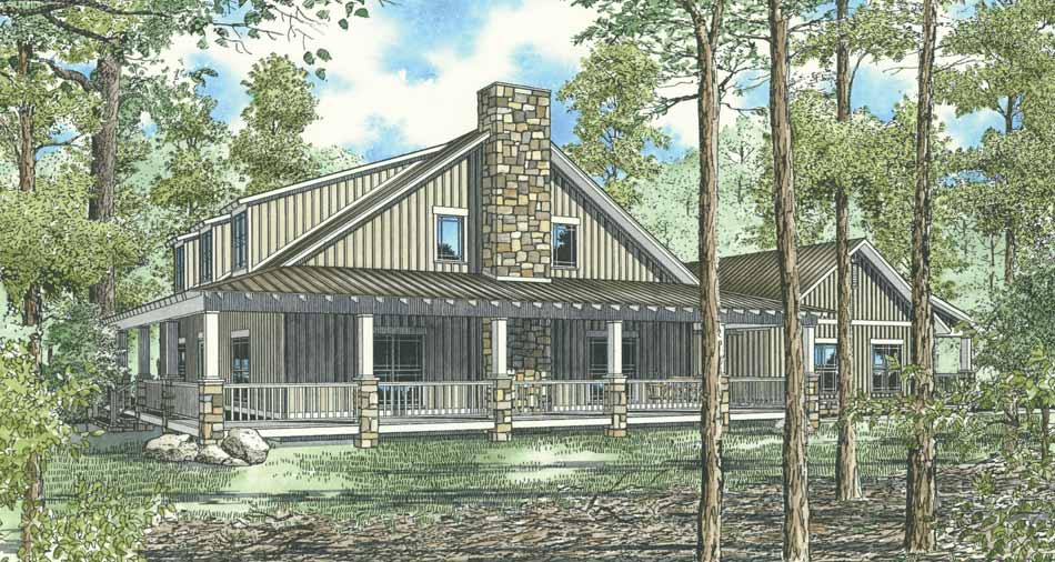 a rustic home with vertical board and batten siding stone dark bronze metal standing seam roofing natural timber posts retain the exact structure window arrangement doors porch full stone columns rooflines foundation height and proportions exactly as shown in the reference image surround the property with a lush dense forest of tall mixed evergreens and hardwoods create ultra realistic lighting crisp shadows detailed textures in the wood siding and glass reflections and a vibrant clear sky with light atmospheric depth render in hyper realistic architectural visualization quality 8k resolution shown entire railing on porch