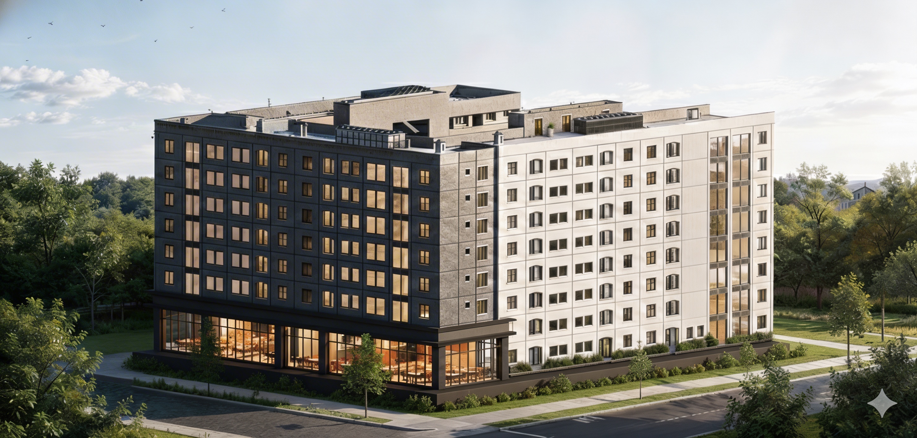 active office building rendering improve materials evening gradient sky wet streets landscaping maintain colors gentle light on building face