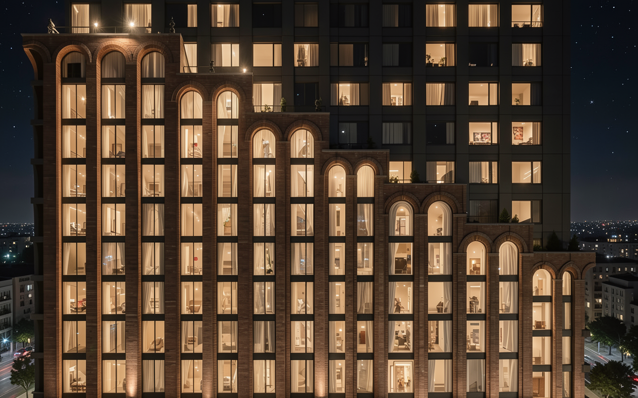 create a photorealistic architectural rendering using the provided sketchup model as the base geometry this is the entrance of a luxury condominium building with a prominent canopy maintain the existing proportions and architectural elements from the model a rectangular canopy projecting above the entrance glass curtain wall above the canopy revealing the slab of the upper floor behind the curtain wall there is a feature wall with rounded edges in a warm orange brown tone that wall contains the building logo centered and backlit with soft led lighting the main entrance doors below the canopy should be glass with elegant metal framing materiality and style facade cladding in dark bronze warm brown metal panels with subtle joints canopy structure finished in brushed bronze or dark champagne metal glass should look clear and reflective showing subtle interior reflections feature wall panels above should and softly curved in a warm terracotta burnt orange color lighting very important warm architectural lighting 3000k integrated above the canopy washing the upper wall and curtain wall recessed downlights under the canopy creating a warm ambiance similar to a luxury hotel entrance soft led backlighting behind the logo on the orange brown feature wall wall sconces on both sides of the glass door respect design but adjust perspective to make the image look more coherent atmosphere and realism evening or dusk setting to emphasize lighting cinematic lighting and reflections on the metal and glass highly realistic materials global illumination and soft shadows luxury residential aesthetic similar to a high end hotel or yorkville condominium entrance clean urban sidewalk in front of the entrance camera eye level frontal perspective centered on the entrance