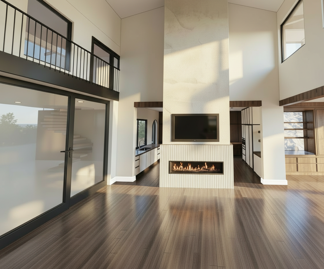 do not change any materials colors finishes or textures in the scene preserve all existing colors materials and layout exactly as they are make all windows fully transparent and clear showing the scene outside do not add frosting blur or opacity to the glass enhance the lighting in the room to feel warm and realistic use soft natural light bounce subtle shadows and warm ambient illumination without altering any materials or colors