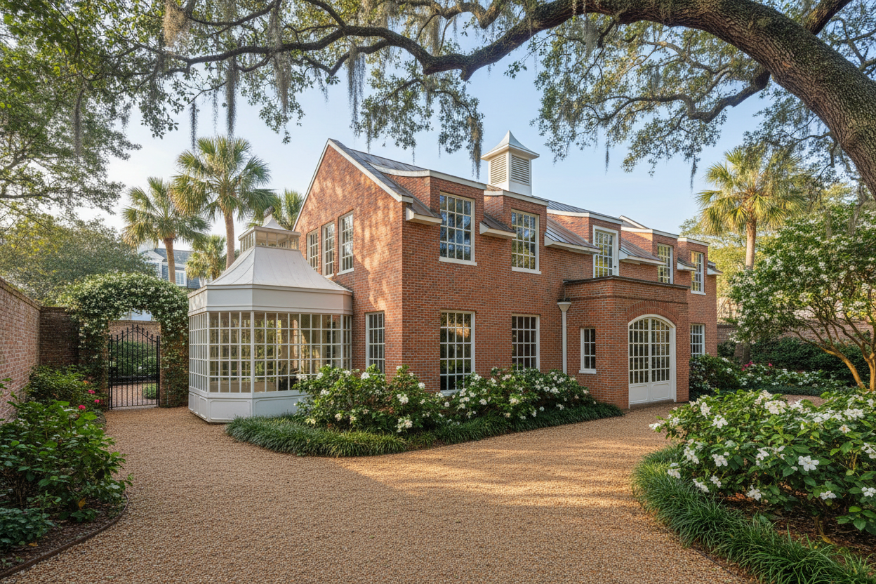the wing walls are dark red brick the concrete patio is antico quoqina concrete finish the spa and firepit have the same stone as the house