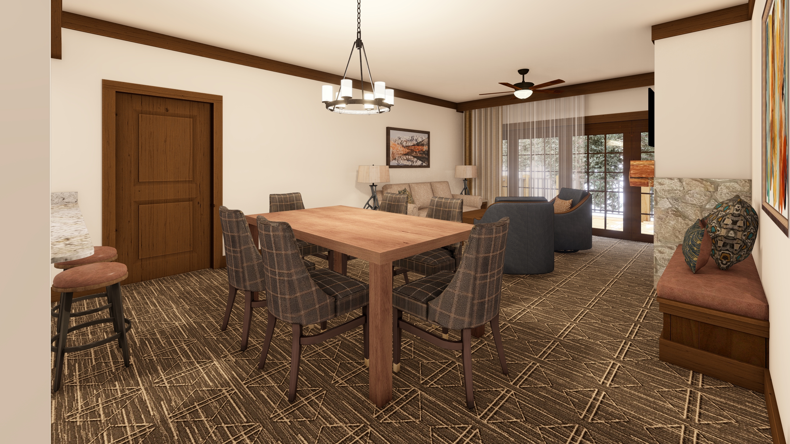 render a cozy rustic living and dining room with a warm inviting atmosphere use rich dark wood for the ceiling beams and door frames the walls should be a soft cream color enhancing the natural light choose a textured beige fabric for the sofa and armchairs accented with dark grey blue cushions the dining table and chairs should be a warm chestnut wood with chairs upholstered in a plaid pattern of soft grays and muted earth tones incorporate a modern brushed metal chandelier with white frosted glass shades for an elegant touch the carpet should feature a geometric pattern in shades of soft browns and creams include a stone fireplace with a wooden mantel on one side and a softly blurred colorful abstract painting above it to add a pop of color the overall feeling should be warm cozy and sophisticated