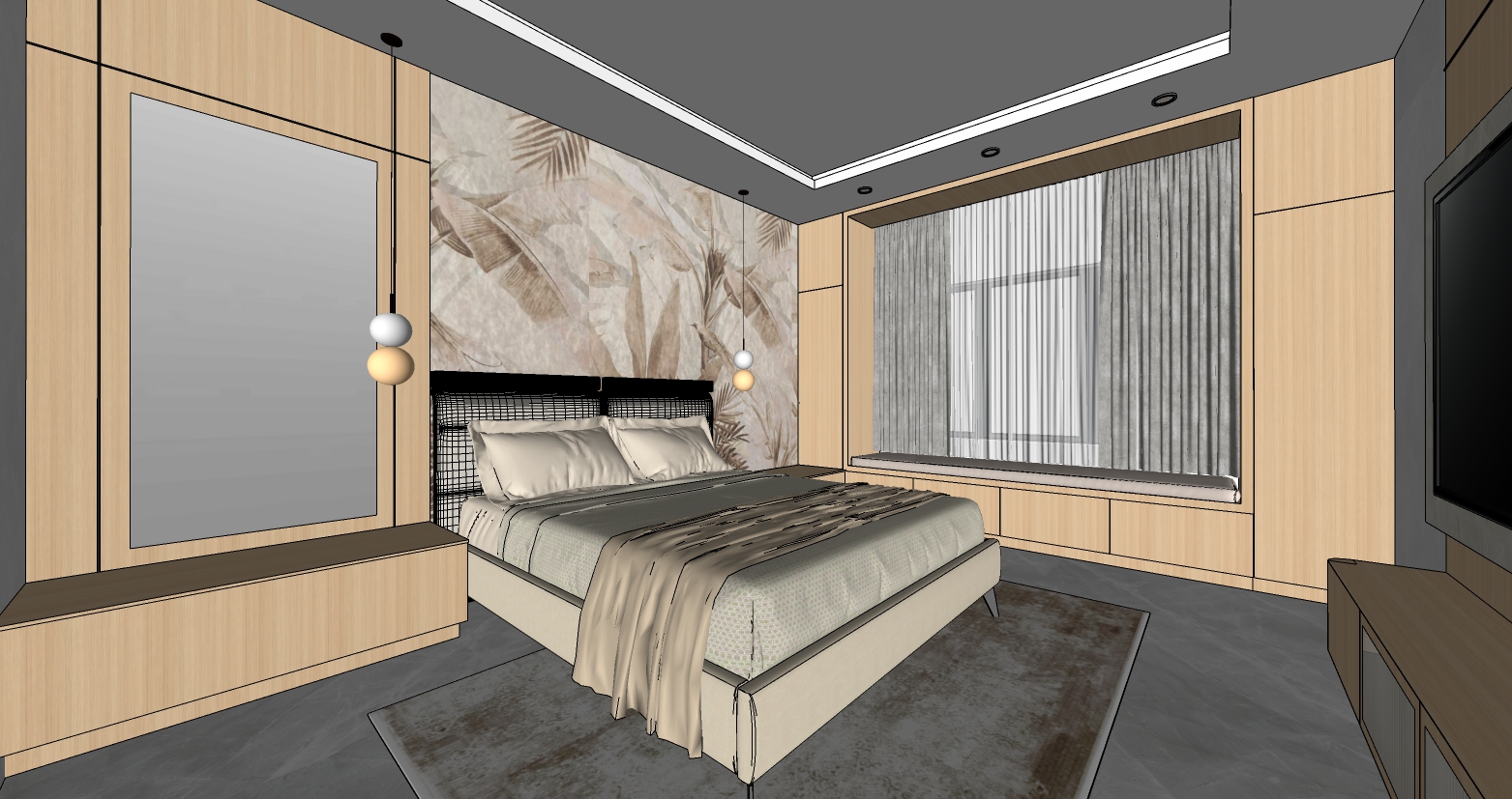create a realistic render of the master bedroom provide illumination for light fixtures and add cove ceiling provide reflection on the mirror retain the flooring texture