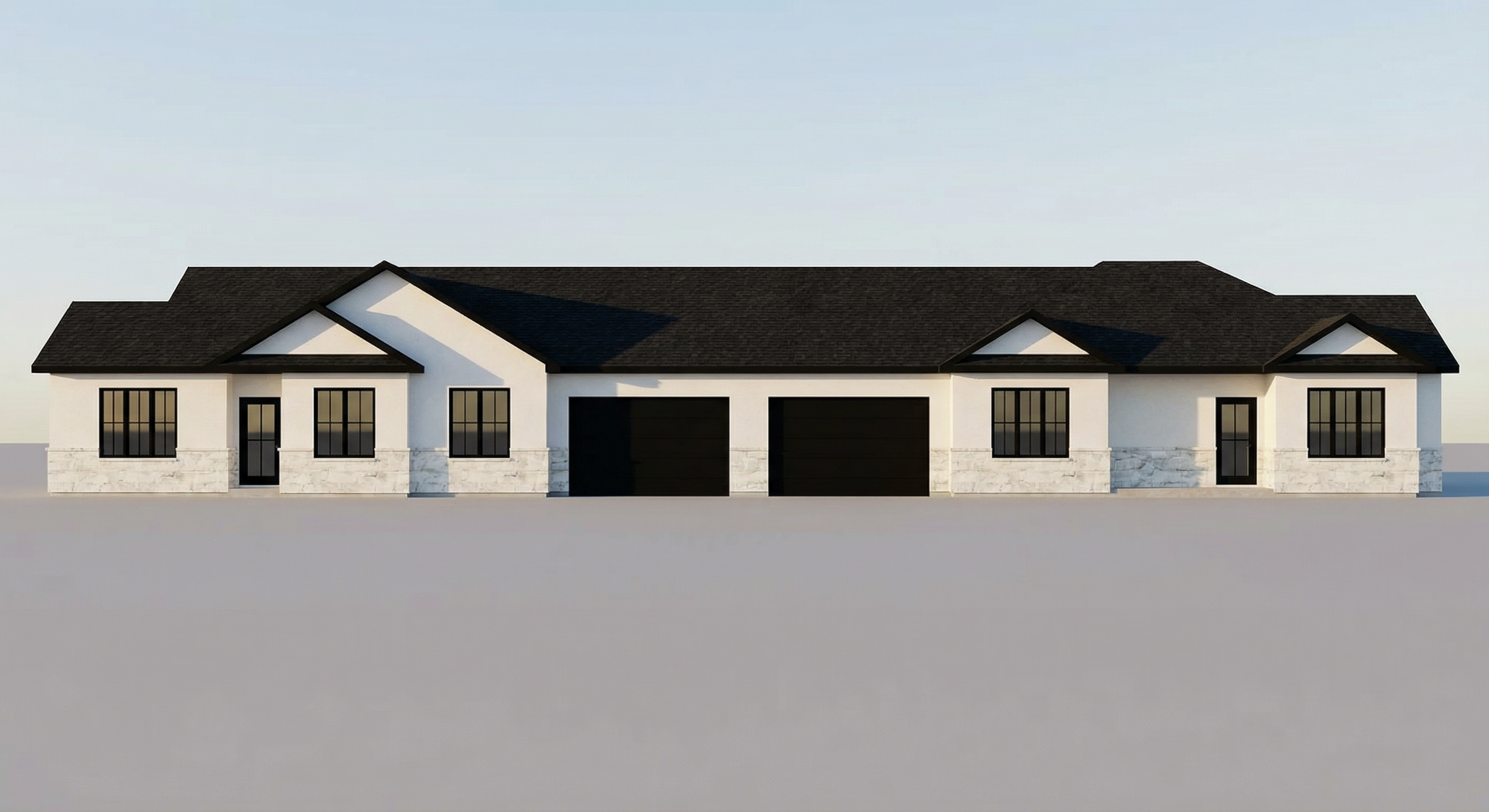 do not change anything except the following black front doors with 3 4 lite glass pane covering the top 75 of the door with privacy glass add white onyx stone skirt around the entire unit except the garage doors change the top row of windows on the garage to 4 windows