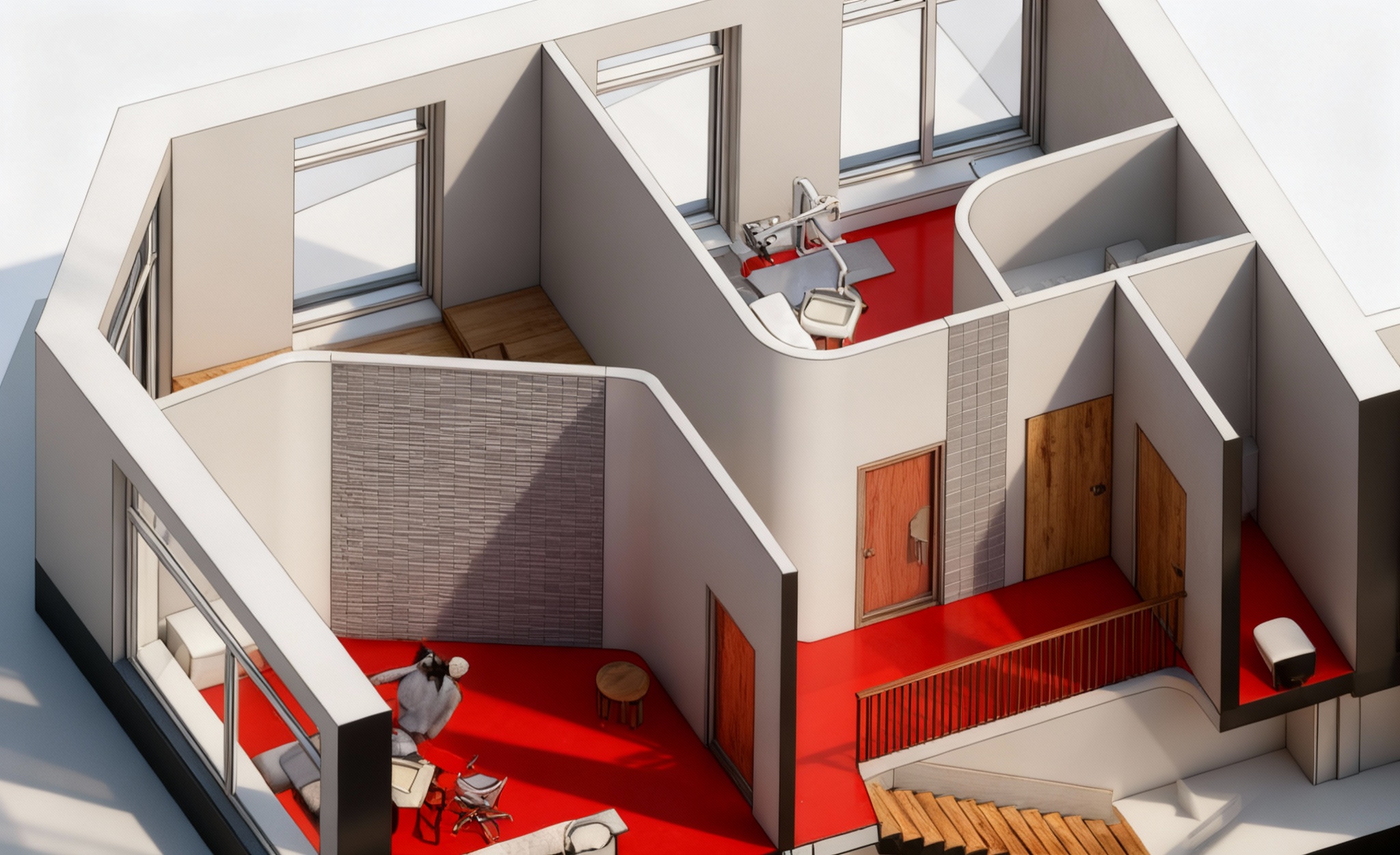 match the sky lighting and atmosphere to the reference soft morning light pastel tones match the background environment clean park like greenery soft trees light haze no heavy contrast reproduce the travertine material exactly as in the reference image smooth uniform beige travertine with subtle horizontal pattern soft reflections no rough texture no strong seams match the white wall material to the reference clean matte white soft warm highlights match all glass subtle reflections clear transparency soft blue tint as in the reference match the swimming pool color light turquoise blue water clear reflective pastel tone overall keep the architecture unchanged only match lighting materials background and color palette to the reference