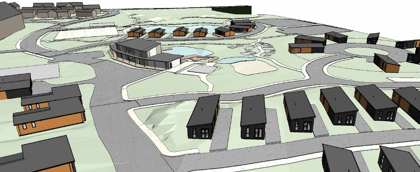 a photorealistic architectural render of a contemporary uk holiday lodge and caravan park viewed from an elevated oblique angle the scene features neatly organised modern timber clad holiday lodges with dark roofs arranged along gently curving internal roads in the foreground show three rows of rectangular single storey lodges positioned on individual plots each with paved parking bays and small lawn areas at the centre of the site depict a large curved community hub building with full height glazing and a low pitched roof facing towards a landscaped recreational area around the hub include naturalistic outdoor pools shallow water features and soft formed play spaces with light sandy surfaces pathways curve organically around these landscaped zones behind the hub building show a circular arrangement of additional lodges around a central landscaped island each positioned to face inward scattered throughout the site include more standalone lodges placed irregularly along winding roads with planted verges and open green spaces in the distance portray further accommodation units and boundary vegetation blending into the surrounding countryside use accurate materials dark composite roofing warm timber cladding tarmac roads light gravel footpaths and natural grass textures lighting should be bright clean daylight with soft shadows and a calm atmosphere emphasise high realism refined landscaping detailed textures and accurate massing consistent with the layout shown ultra realistic 8k quality architectural visualisation style