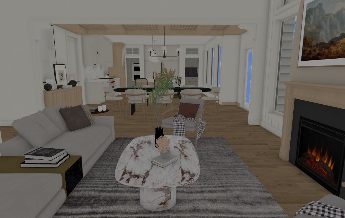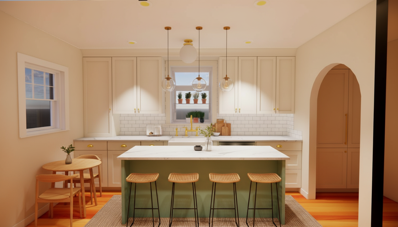 keep all colors the same transform this architectural interior design drawing into a photorealistic rendering maintain the exact layout dimensions and placement of all elements do not change materials colors or geometry additionally apply a very subtle hand drawn architectural sketch overlay faint pencil line edges around furniture silhouettes cabinetry and key architectural elements as if barely sketched over the photograph keep it extremely subtle the photorealistic image must remain fully dominant
