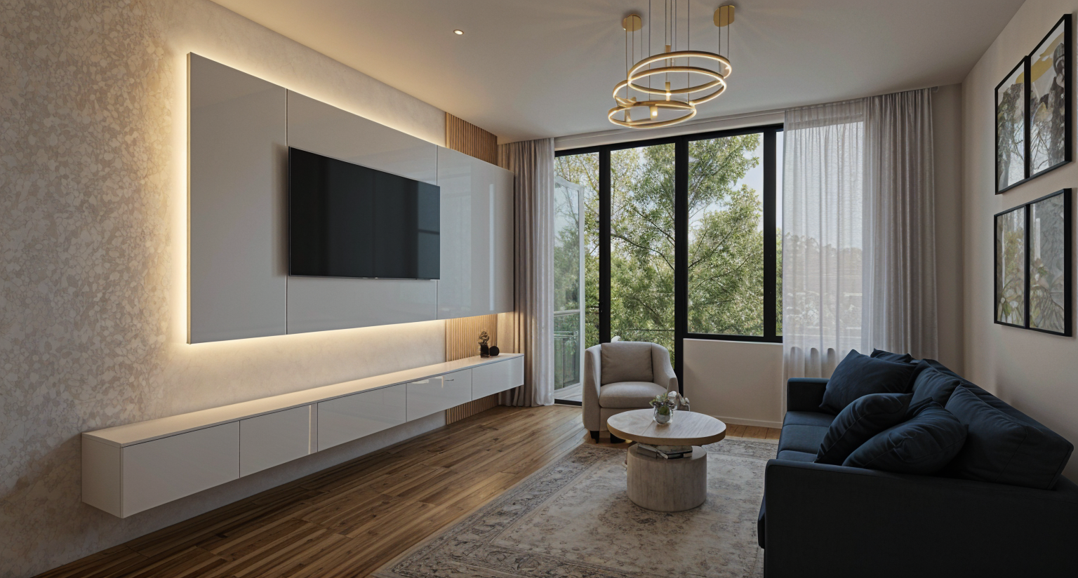 minimalism interior shot keep all of the base do not modify colors of furniture do not remove anything do not replace anything add decoration that fits in with the existing style architecture