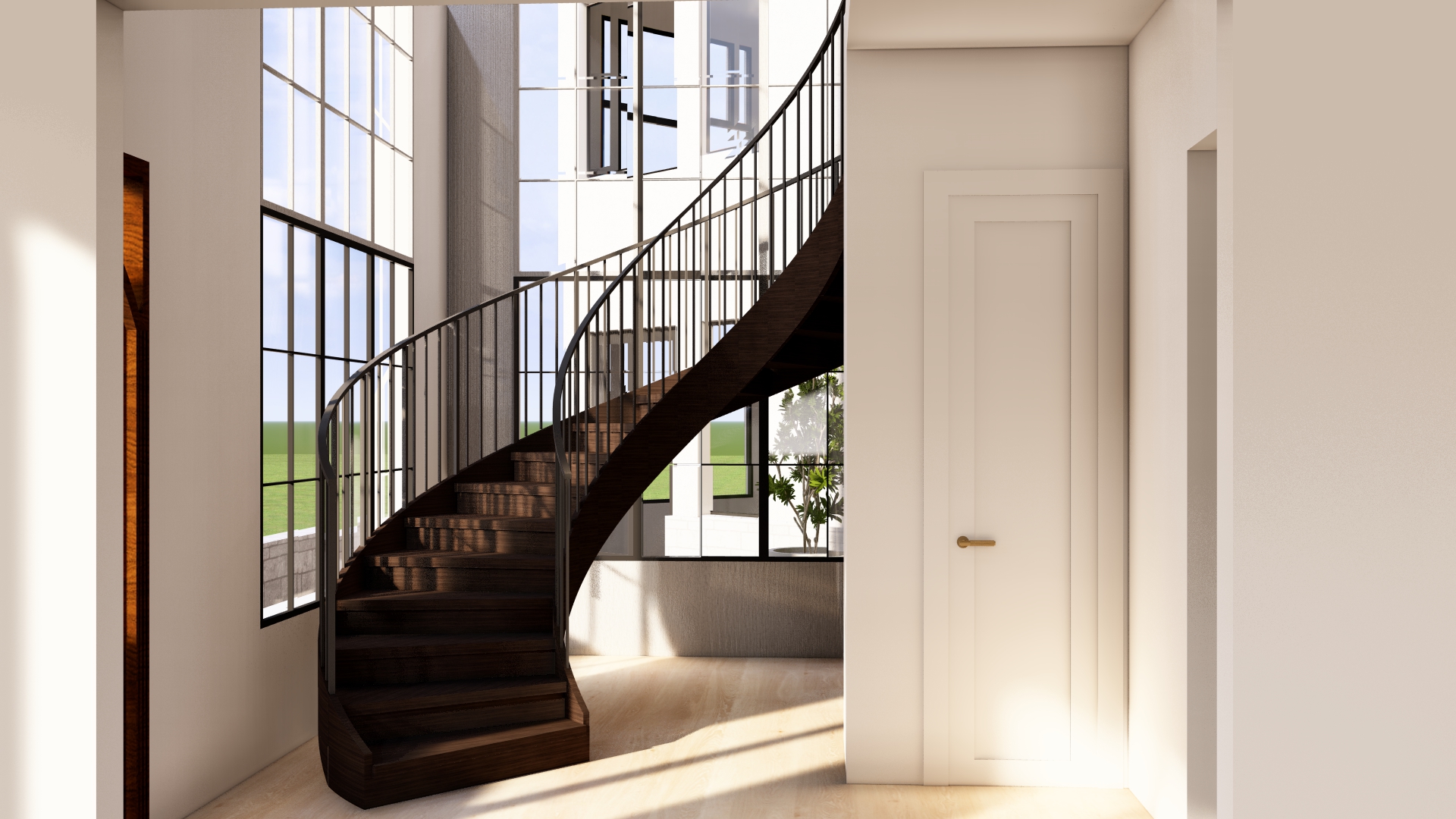 interior shot a beautifully rendered modern interior featuring an elegant curving staircase with sleek black railings and rich dark wood steps next to a large arched window flooding the space with natural light the walls are a soft cream creating a calming atmosphere outside vibrant green grass stretches beneath a clear blue sky with fluffy white clouds the scene feels open and airy blending modern architectural elements with serene natural beauty adjust to render entire photo
