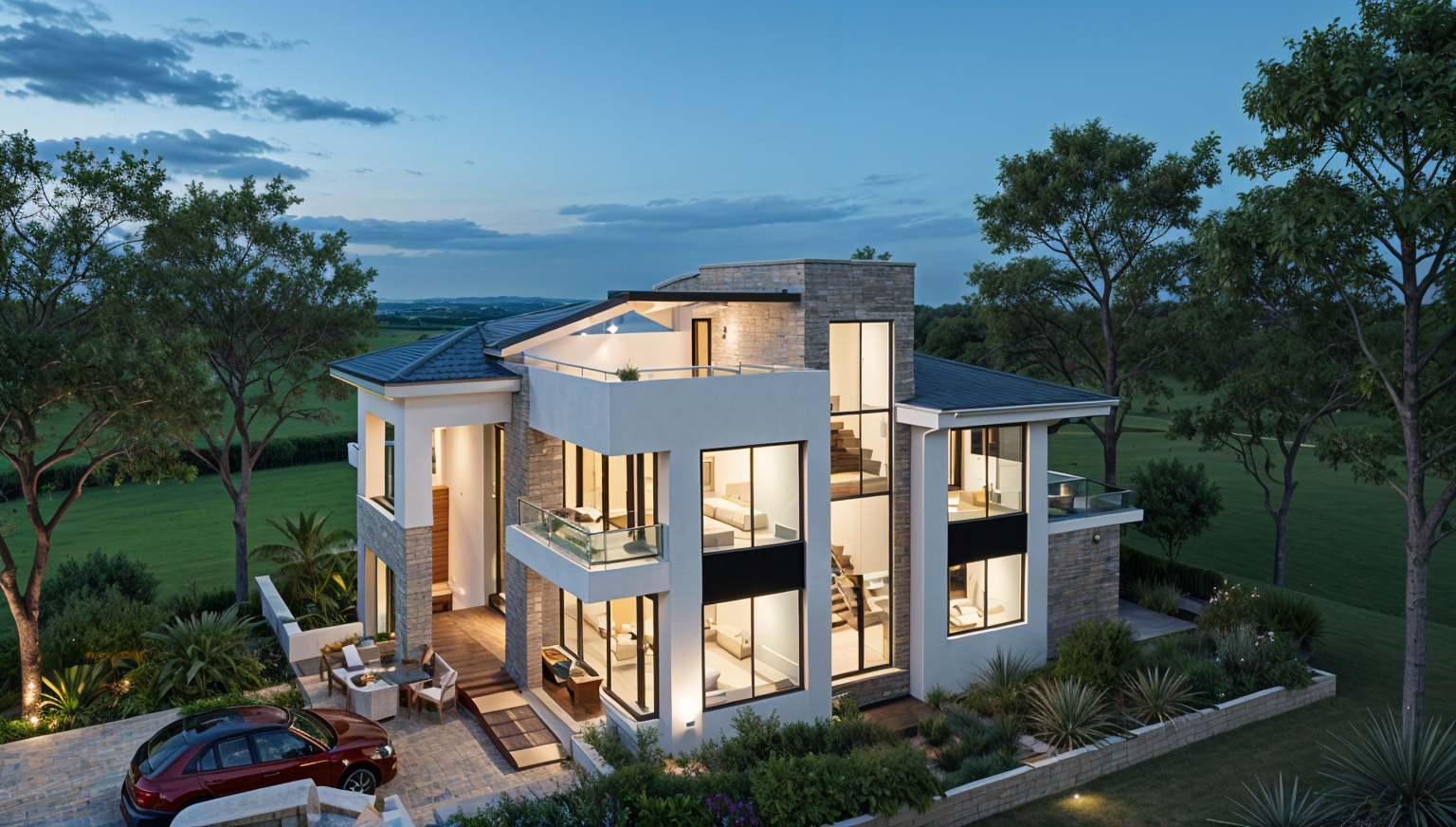 better lighting and bush gardens only on green grass area keep concrete ground