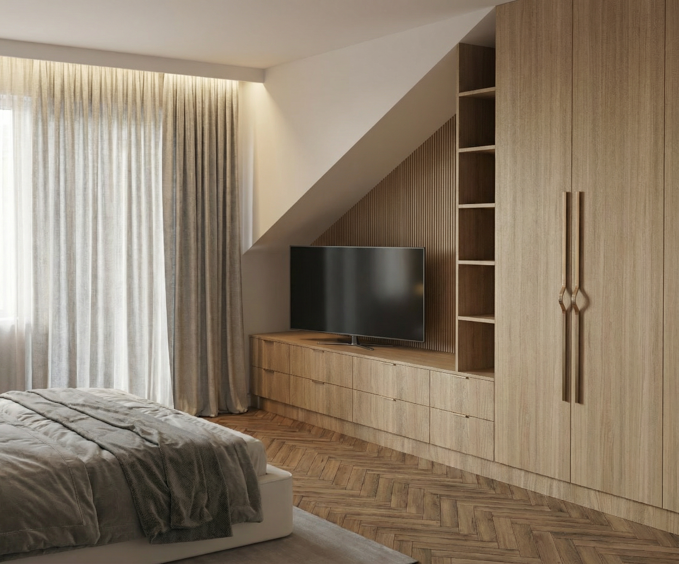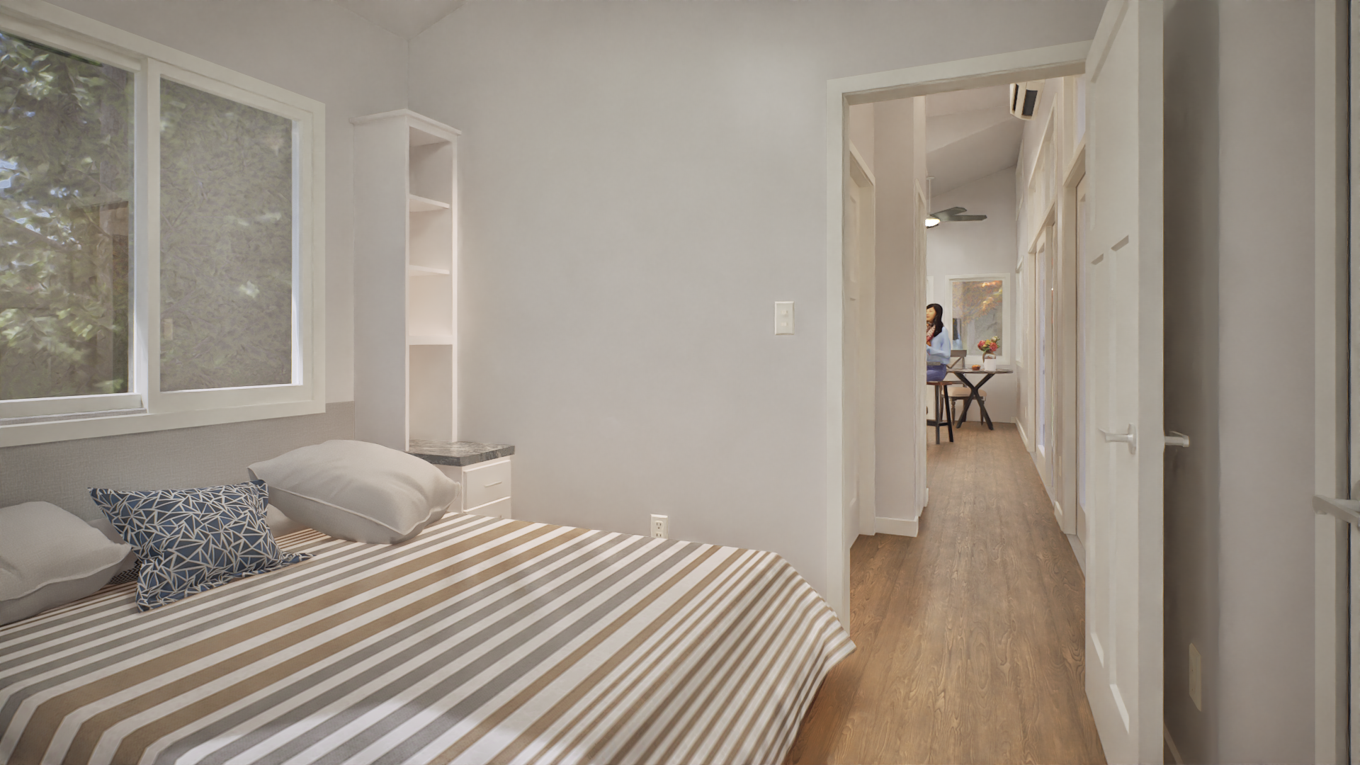 photorealistic interior architectural photography warm natural daylight under cabinet lighting and illuminated can lights in the ceiling soft directional light with realistic shadow falloff and gentle contrast bright but warm atmosphere realistic global illumination with subtle ambient occlusion in corners and at material transitions dslr with a 35mm lens eye level perspective professional architectural composition and framing and realistic depth slight depth of field foreground and midground in focus background softly flailing off physically based materials throughout with enhanced texture detail natural surface variation and subtle imperfections with realistic sheen high quality windows with realistic thickness subtle reflections of the interior soft exterior reflections and accurate light transmission windows feel transparent exterior visible through windows feels real and grounded with natural daylight realistic trees and landscape interacting with the light warm color temperature balanced with natural daylight soft highlights realistic shadows gentle contrast subtle camera noise natural exposure not overly sharp soften corners and edges professional photography style