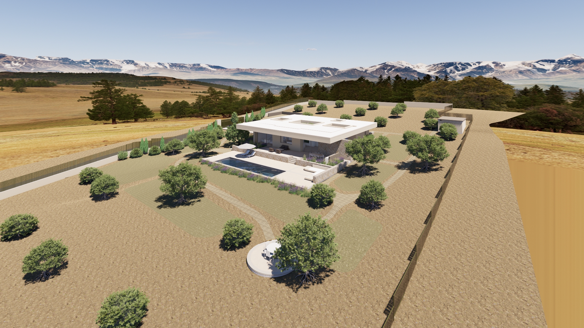 a modern villa in a serene countryside landscape the villa features a beige exterior with clean minimalist lines and stone surrounding the villa are lush green shrubs and trees adding vibrant greenery the pool is a grey blue color creating a tranquil atmosphere the rolling hills in the background are golden with patches of green olive trees and cypresses and the blue sky with soft white clouds the overall atmosphere is peaceful and luxurious evoking a sense of relaxation and tranquility