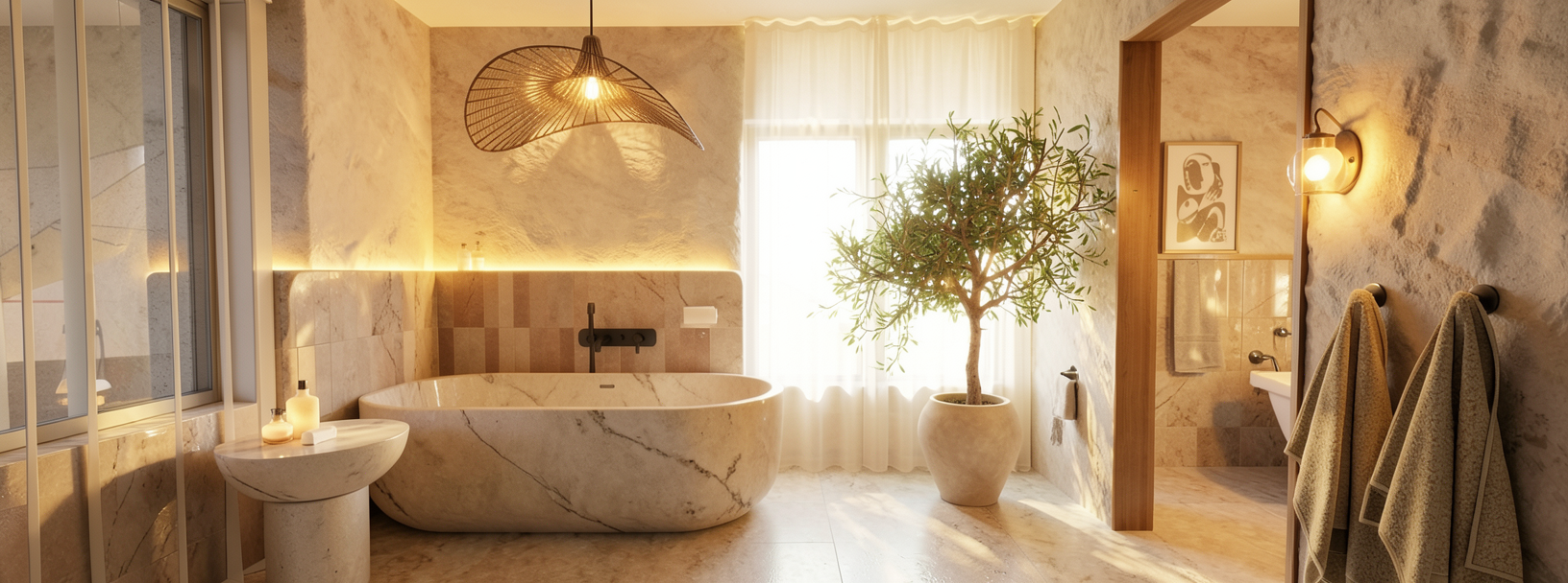 luminous bathroom organic tulllum style beige concrete tub beige stone floor tile the walls are lith off white plaster texture the wall tiles are a mat terracotta with very little color variation