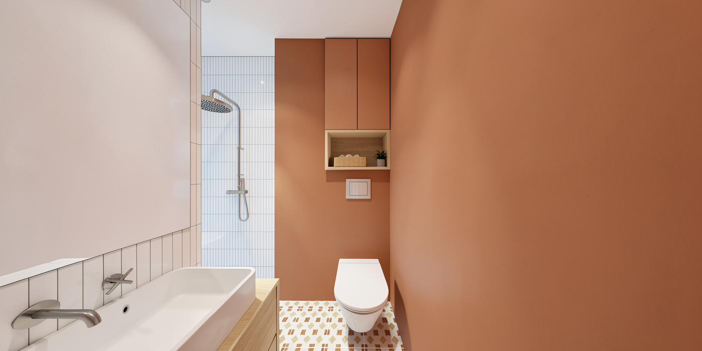 mediterranean villa courtyard with a serene atmosphere featuring a classic two story off white stucco building with soft arches and terracotta roof tiles surrounding lush greenery includes vibrant orange trees and rich purple lavender bushes the sunlit patio area is paved with warm beige stone tiles housing elegant wooden furniture and comfortable loungers with white cushions and green striped pillows a crystal clear emerald pool is the centerpiece reflecting the clear azure sky gentle sunlight casts soft shadows creating a tranquil and inviting ambiance
