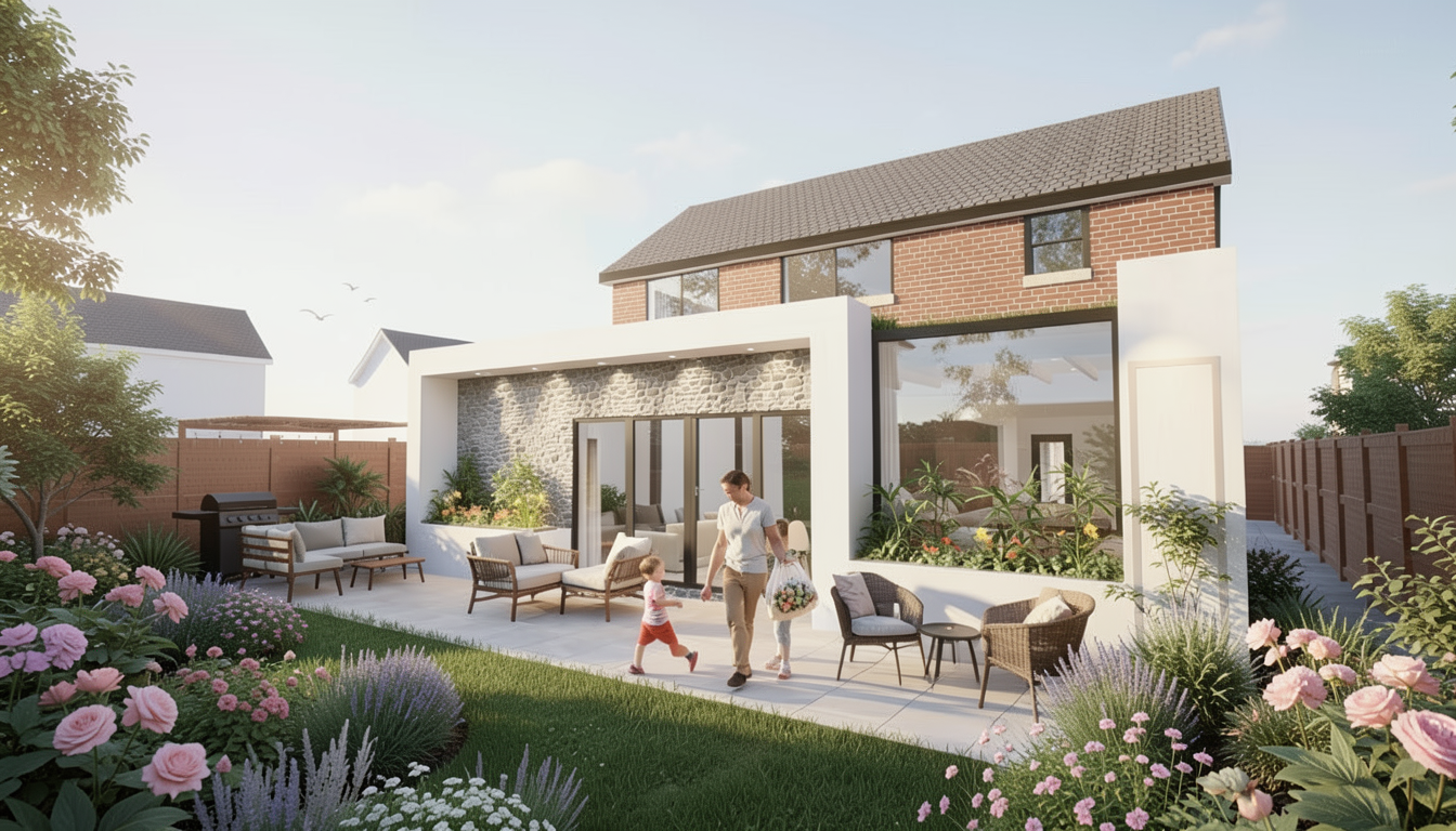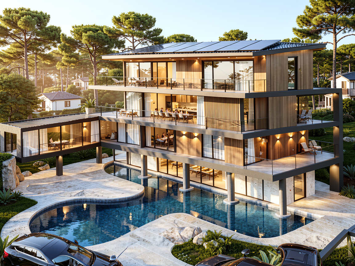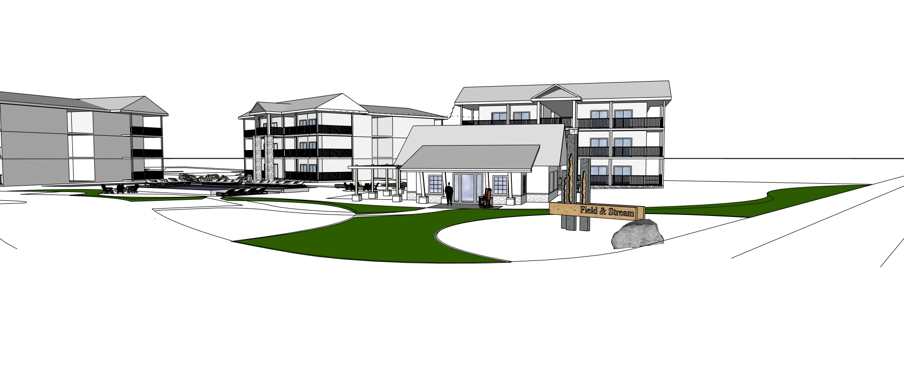 the image represents the approved completed appearance of the building and site design layout including exterior materials color palette detailing weathering level and overall realism maintain overall rustic mountain lodge character preserve the exact geometry proportions rooflines and window placement from the sketchup view do not redesign the building s or site design do not introduce new materials translate the approved look only