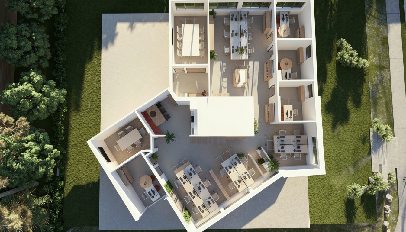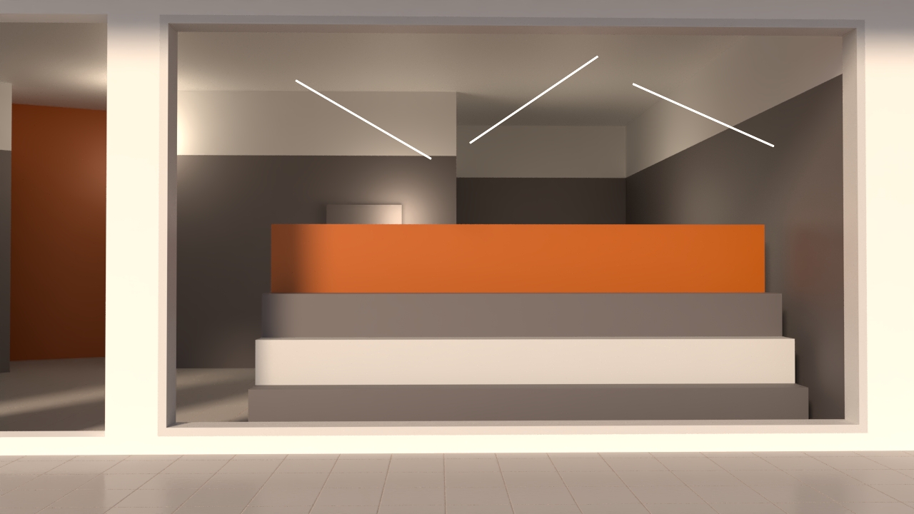 professional photorealistic technology shop rendering with white and mustard color furniture and white ceiling with and emessive white pendant led lighting exposed industrial style gray flooring natural daylight from large windows architectural visualization high ltra detailed 8k resolution photorealistic materials realistic shadows and reflections professional interior photography style depth of field ambient occlusion global illumination put phones and tv pc laptops in front of the furniture that exist behind the window as exibitioning do not change the form of the stands