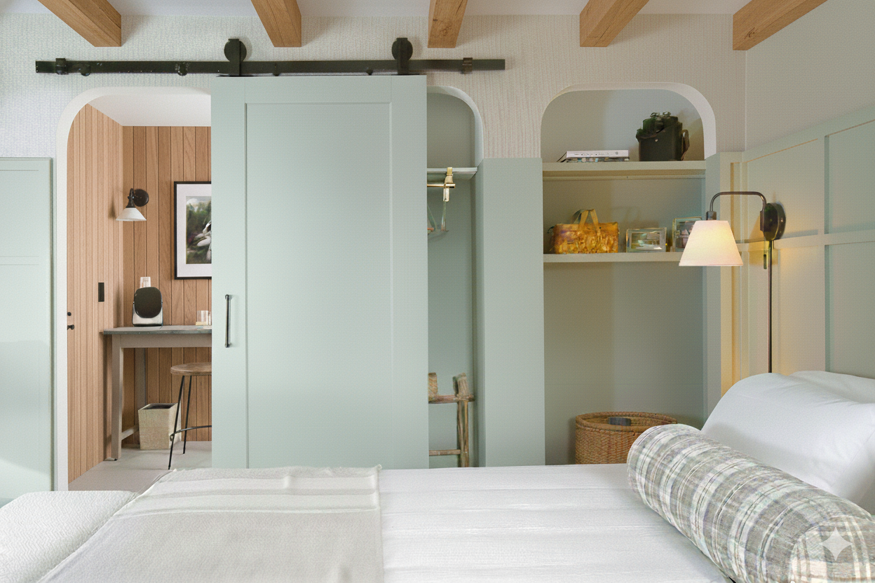 replace wall finish to all paint no molding update bed to a midcentury modern wood headboard