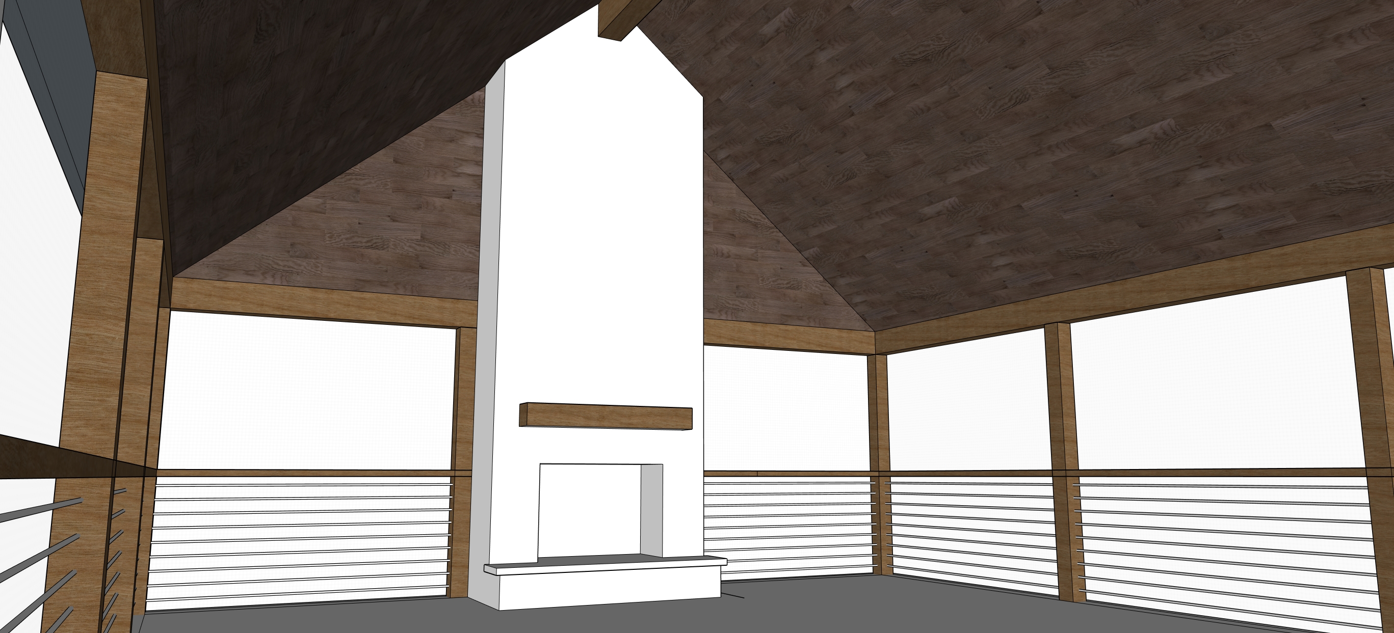 screened in porch stone fireplace with rustic wood mantle tv above mantle vaulted wood ceiling with beam end wall up top is solid with wood wooded background on a steep hill looking down to lake add outdoor furniture