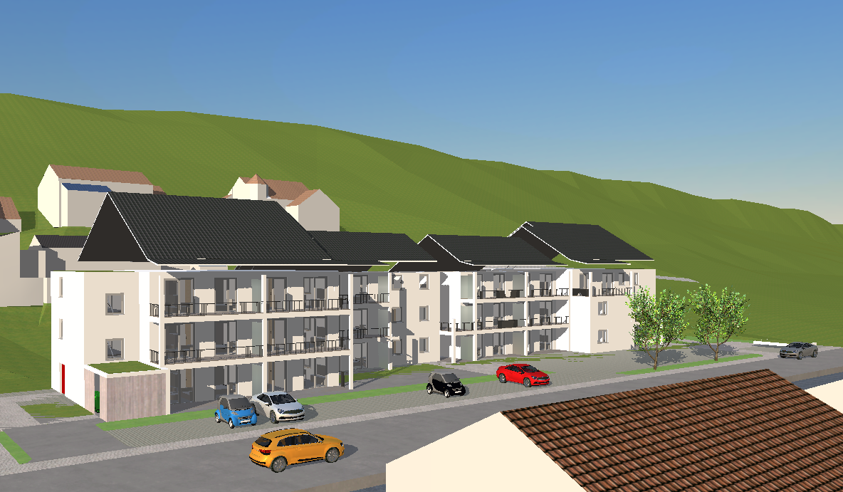 modern residential complex in a serene suburban landscape nestled in rolling green hills with trees on the top under a clear blue sky with few clouds the buildings feature crisp white facades and sleek dark gray roofs surrounding the complex a row of vibrant green trees adds a touch of nature cars in varied colors bright red sunny yellow and sky blue are parked along neat gray cobblestone streets the atmosphere is peaceful and idyllic capturing the essence of a sunny tranquil afternoon