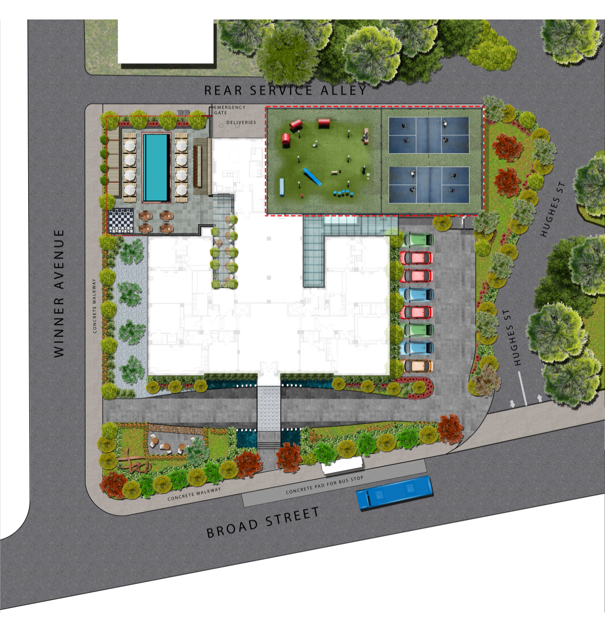 this is a landscape plan of broadwin hotel residents please create a high resolution 3d photorealistic image