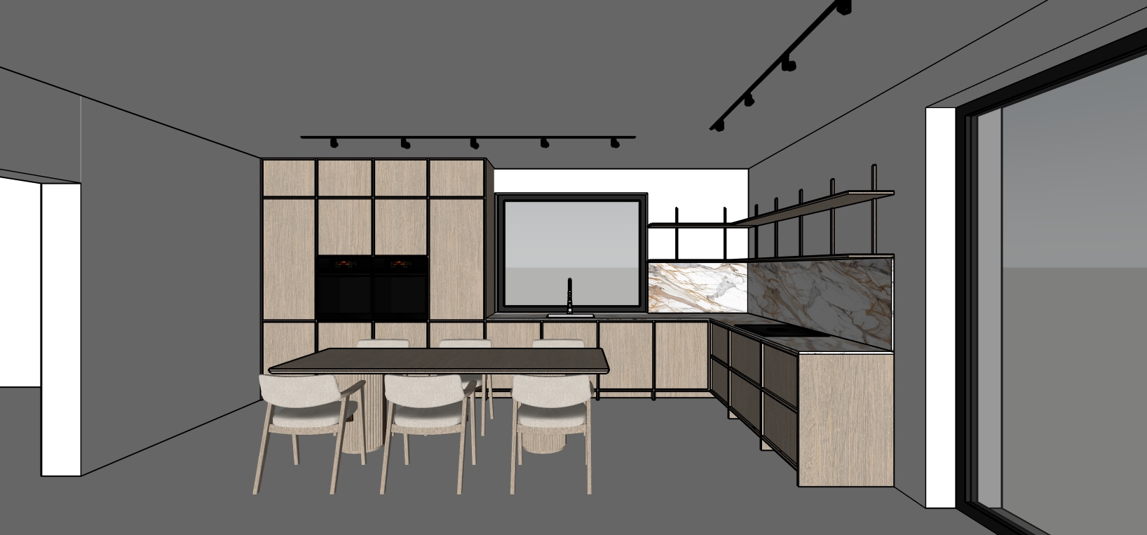 render a modern minimalist kitchen interior with a soothing and elegant atmosphere use light oak wood for the cabinetry a smooth marble texture with white brown and gray veins for the countertop and backsplash incorporate soft gray for the walls and darker gray for the ceiling and floor add sleek black metallic accents for the light fixtures and shelving the dining table should be a rich dark wood and the chairs a soft beige fabric large windows with black frames allow natural light creating an inviting and stylish ambiance