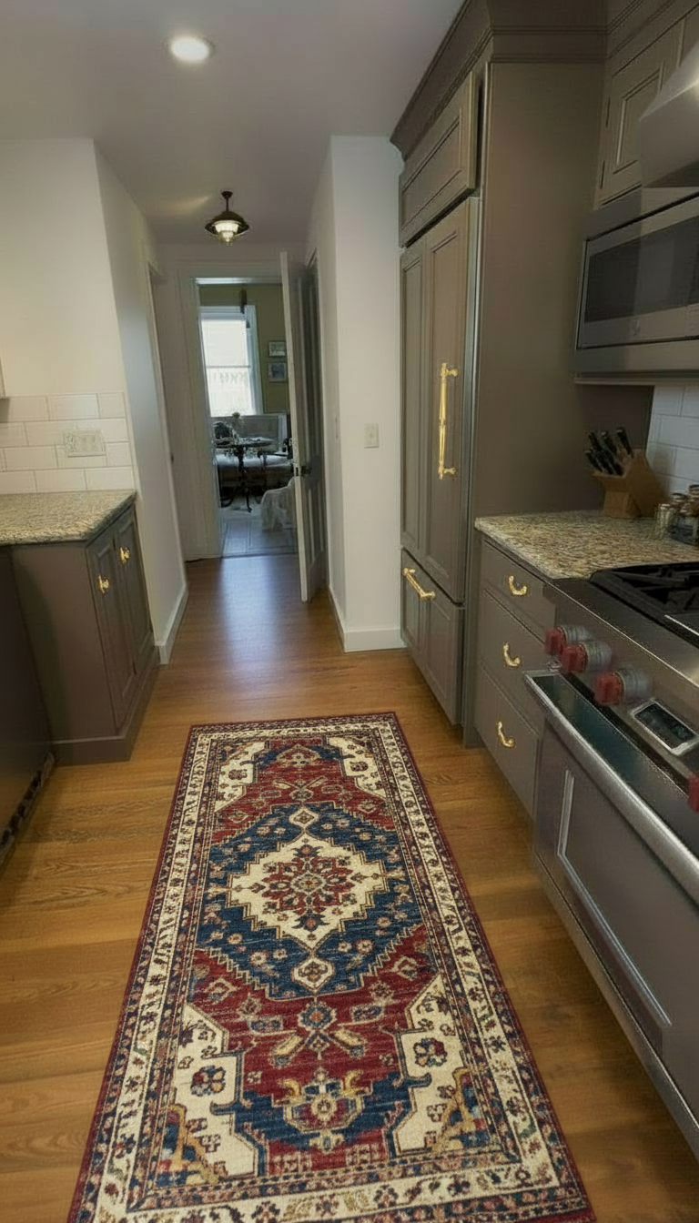 add a traditional runner down the center of the kitchen in taupe dark green and navy blue