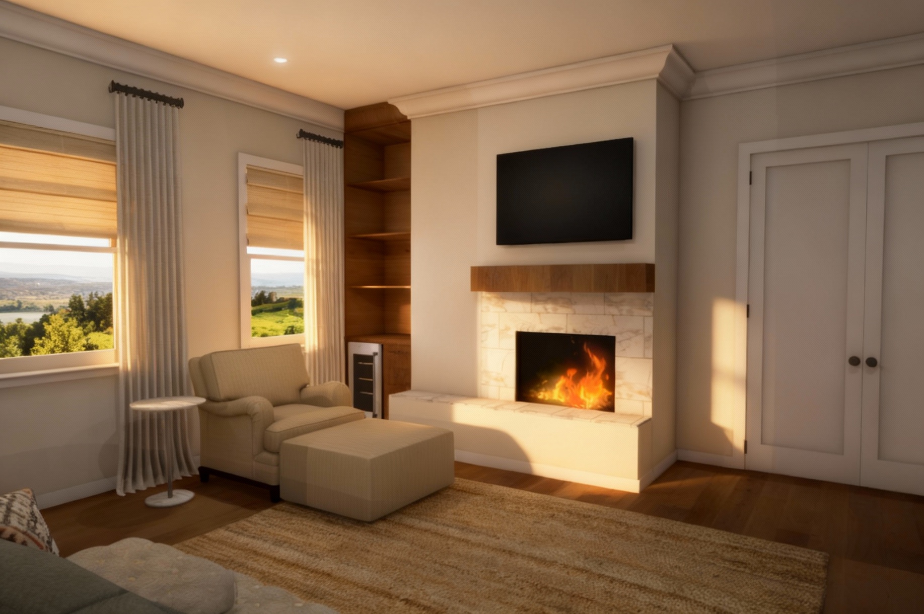 keep everything else identical same materials lighting textures and realism keep the render exactly the same same lighting textures colors and materials extend the stone material all the way up on the two car garage wall and the leftmost wall under the far left window extend the board and batten siding all the way up on the single car garage far right and the wall to the right of the porch remove any half wall material transitions maintain full height materials perfect realism and identical lighting