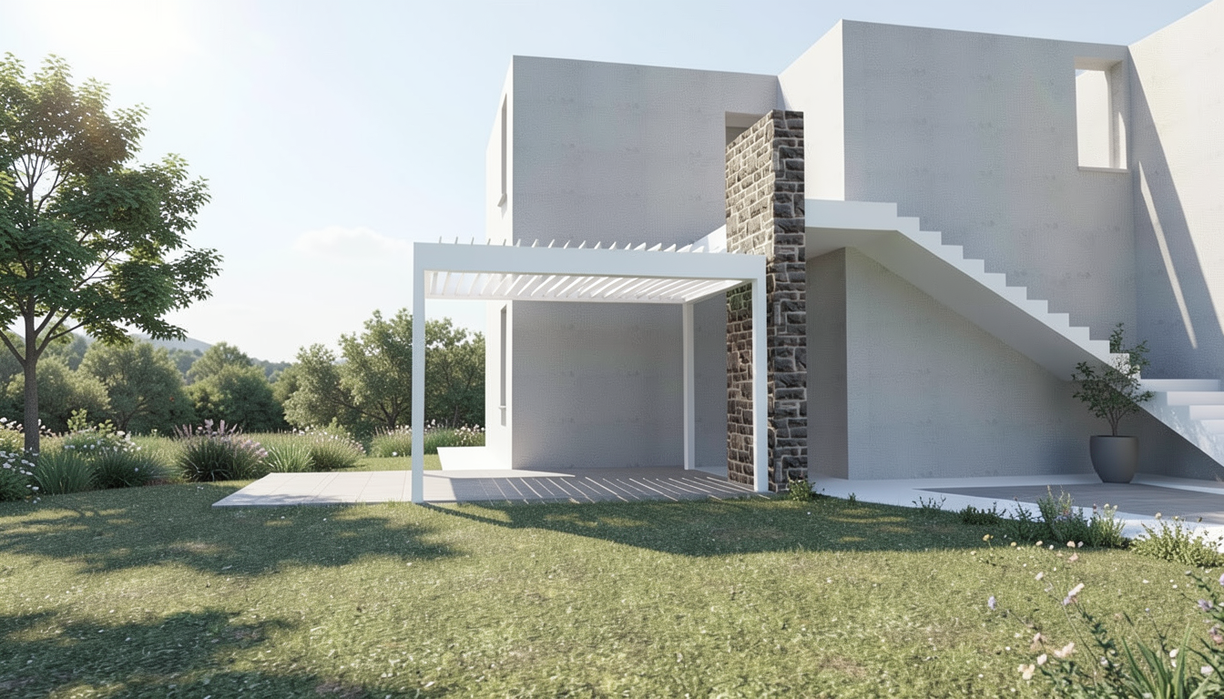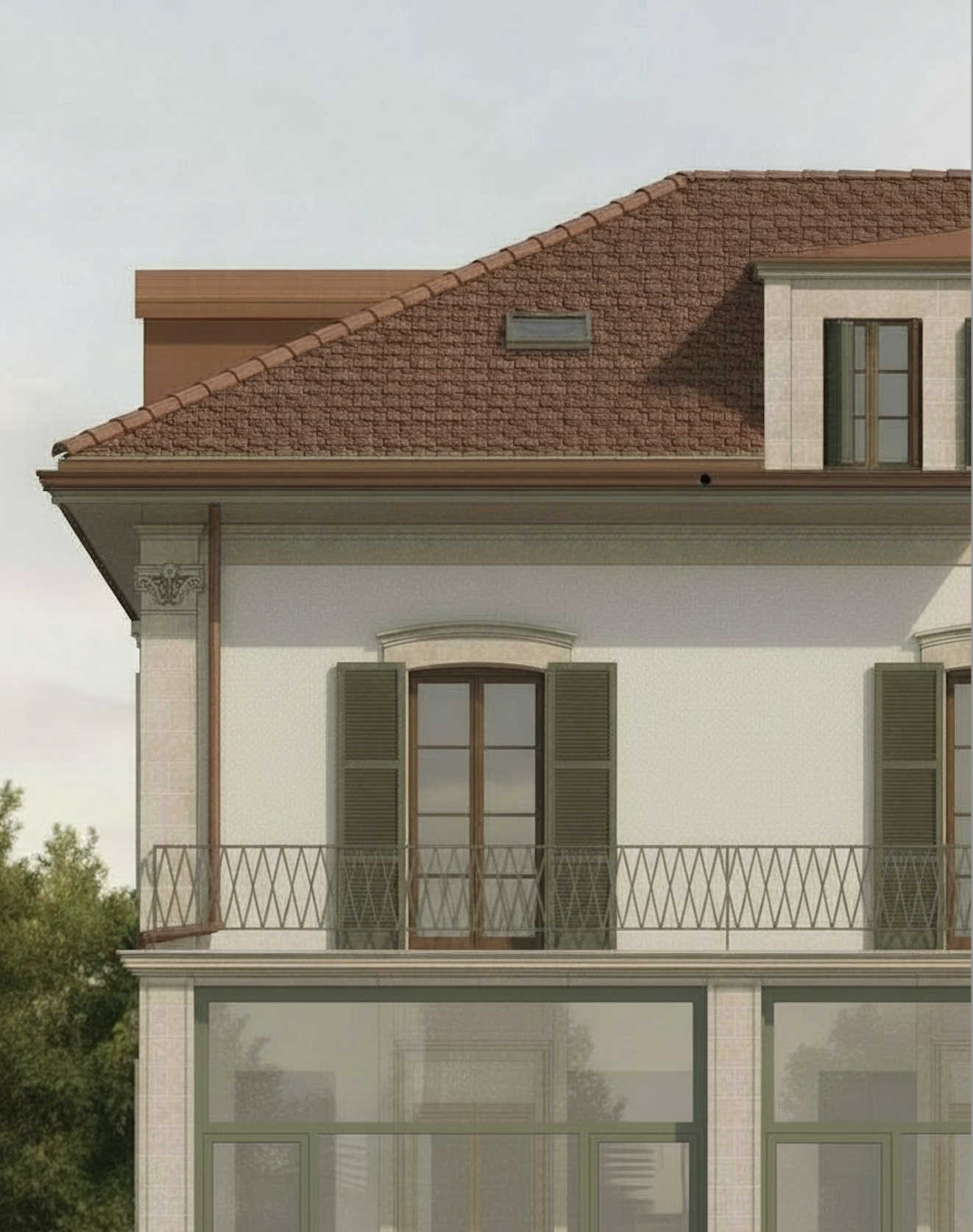 render a photorealistic 3d perspective of this house in a geneva country do not change the view only enhance the current materials and make the landscape nicer vegetation detailed glass reflections and a vibrant clear sky with light atmospheric depth render in hyper realistic architectural visualization quality 8k resolution