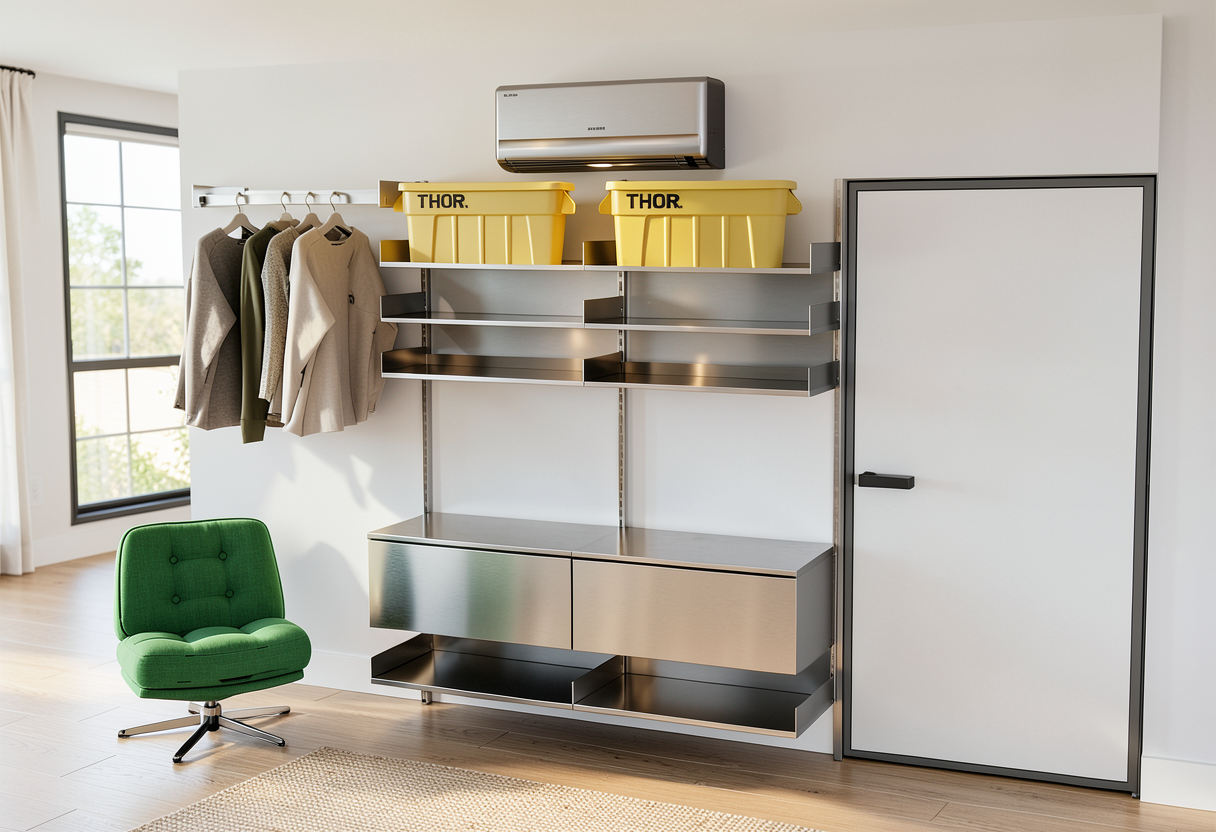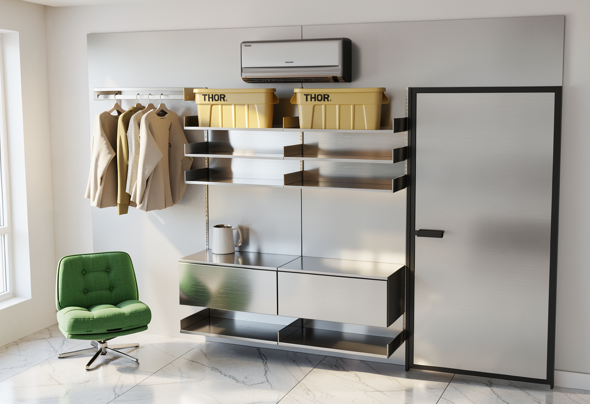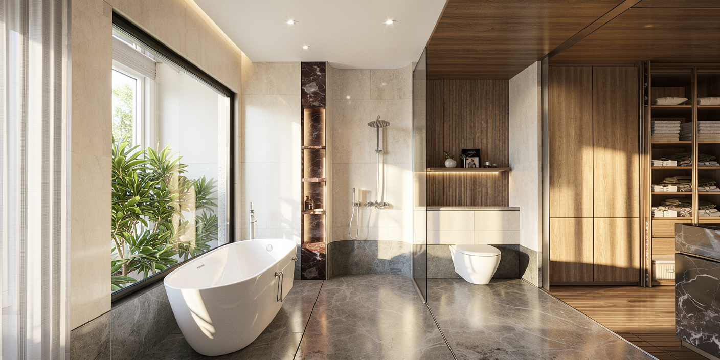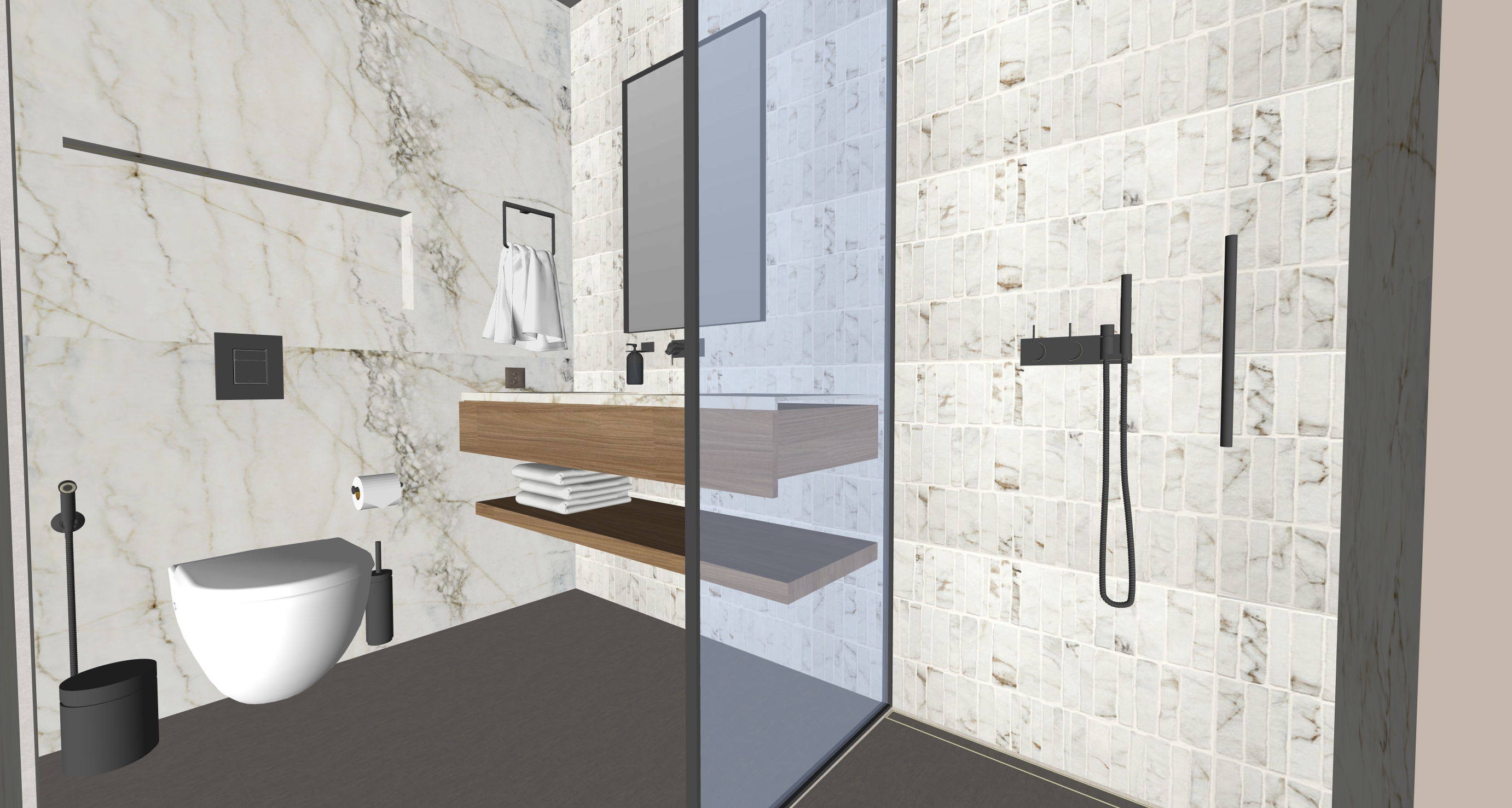 keep exactly the same geometry make materials more realistic make lighting more realistic the furniture of the sink have warm walnut seamless oak texture add hidden led light on the top of the recess above the toilet and also under the shelve below the sink furniture pots and acessories of the bathroom are gun metal color